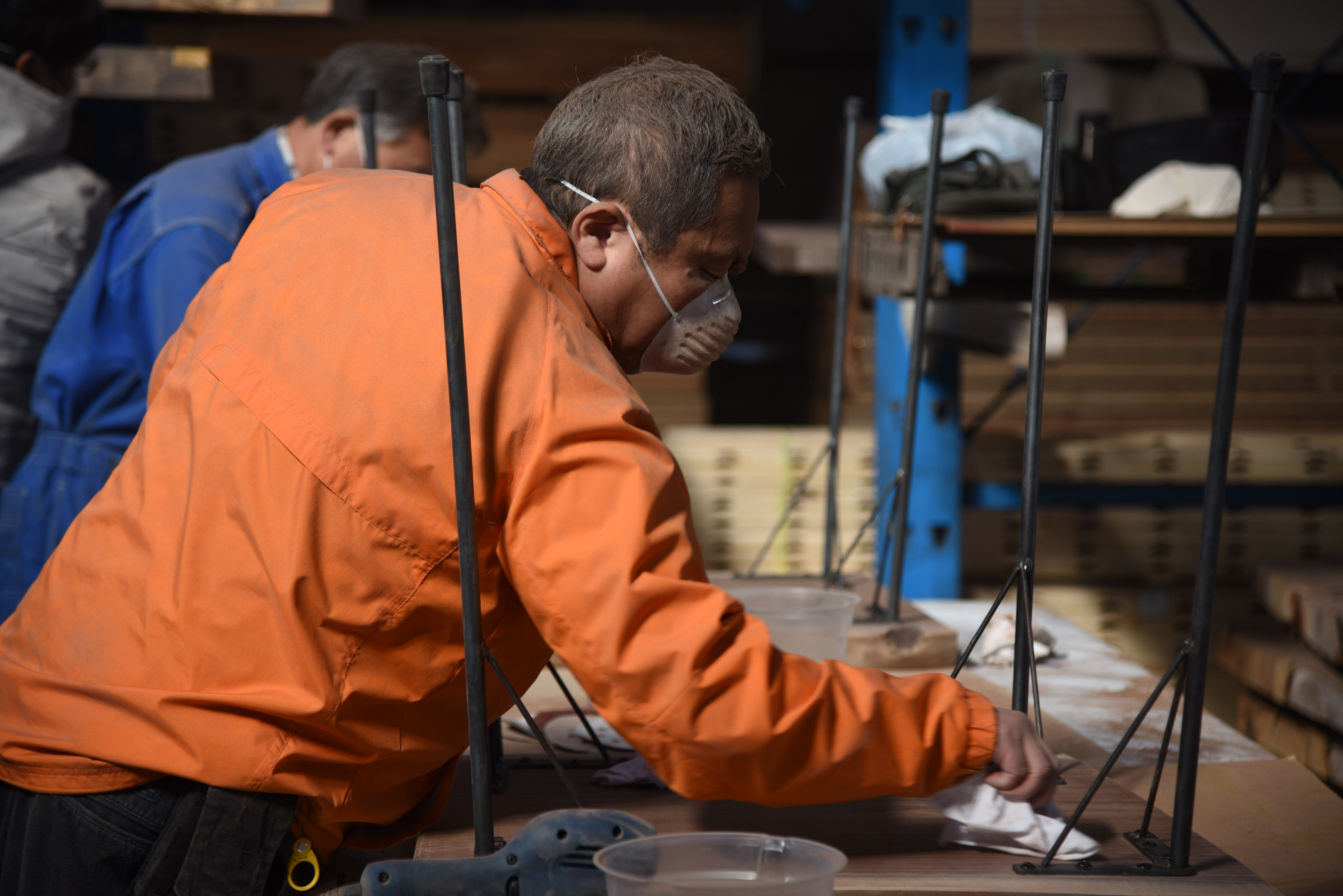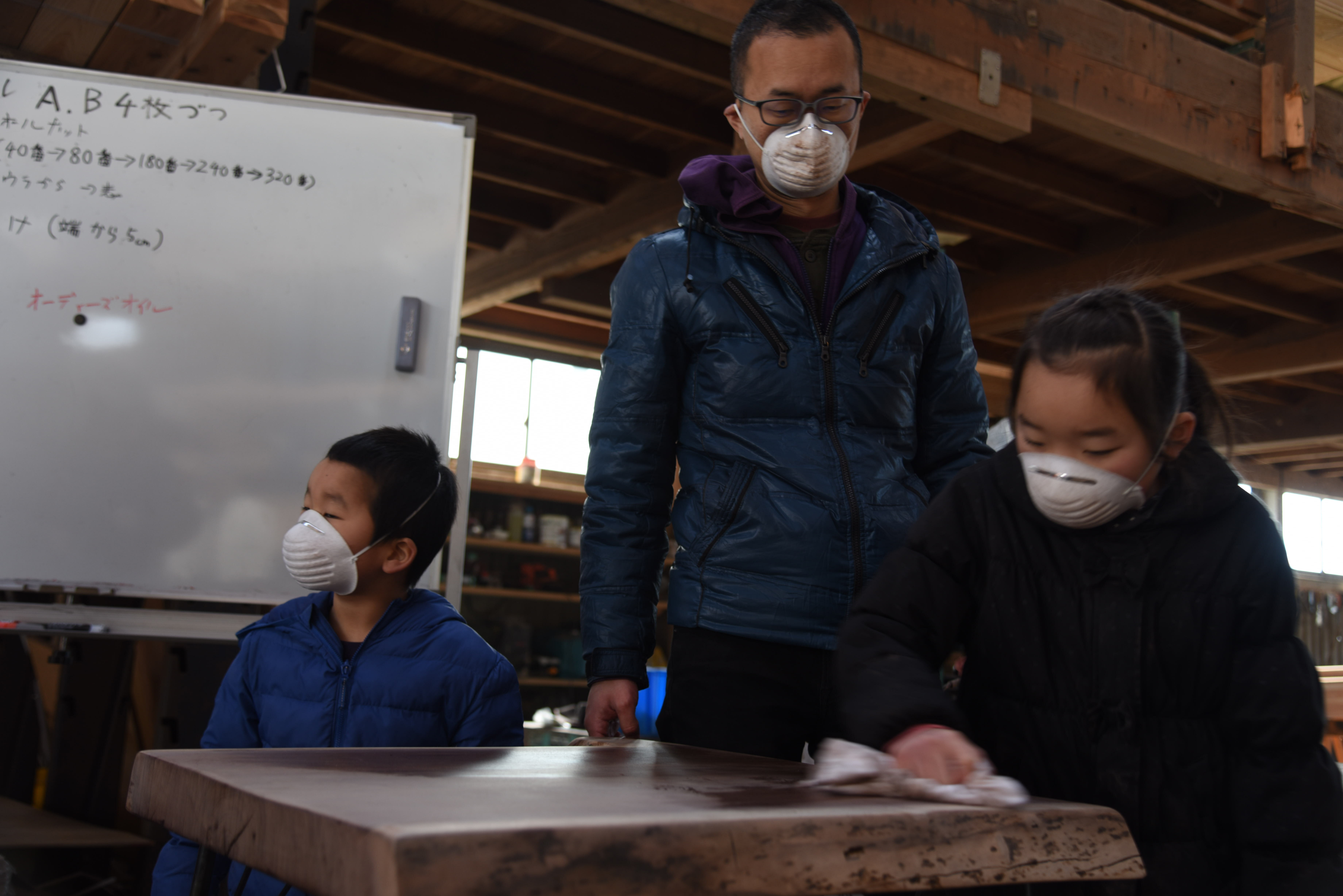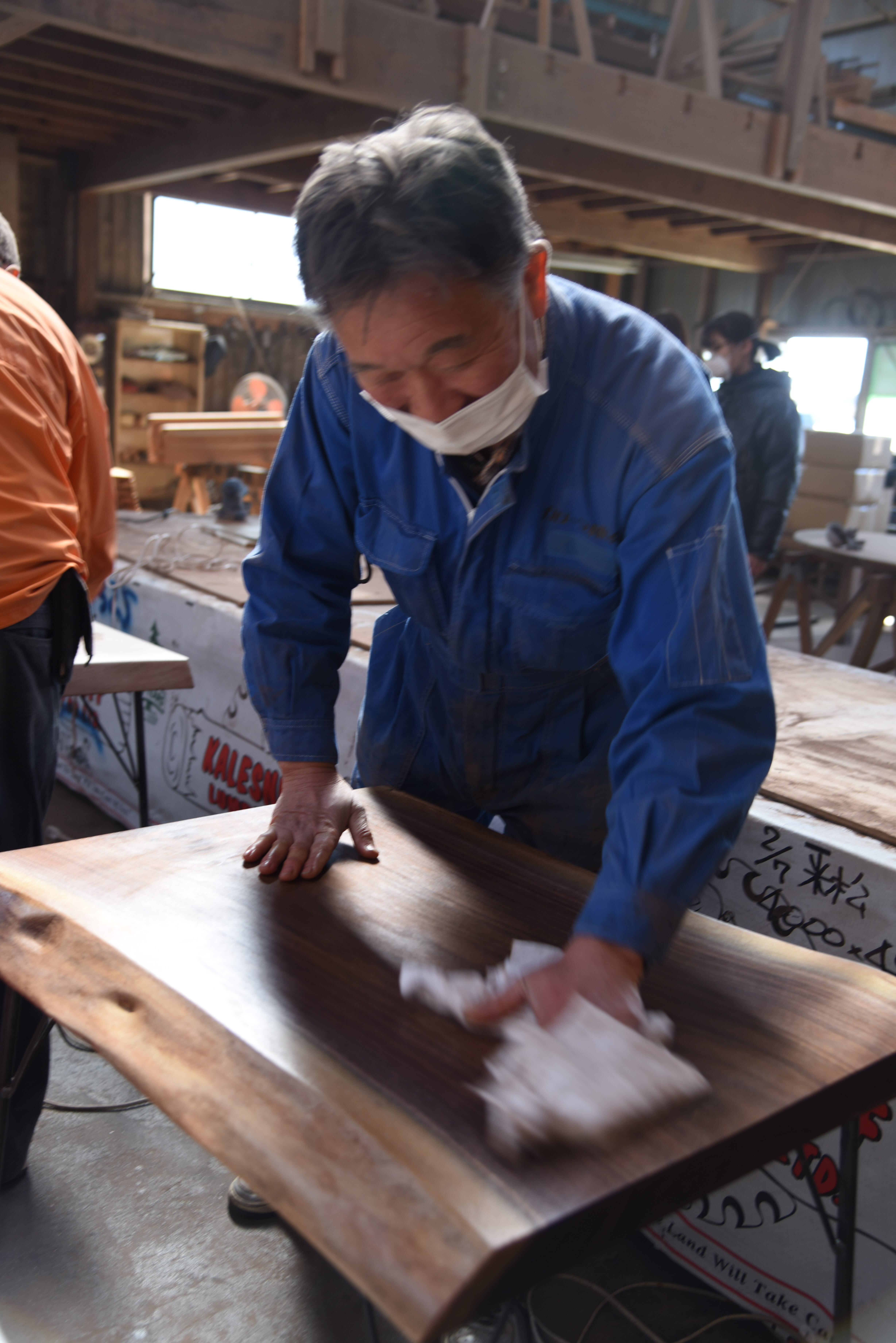 最後にオイルの下地を塗ります。用意して頂いたのは天然素材のもので、飲んでも身体に害がないものだそうです。そのまま手に塗りたいくらい香りも爽やかです。エアーで細かい木の埃を取り除いた後、布で薄く塗りこむと感動的な木目と色合いが顔を出します。なんてかっこいい!皆さん、ご自身で磨いたテーブルを愛おしそうに塗って下さいました。