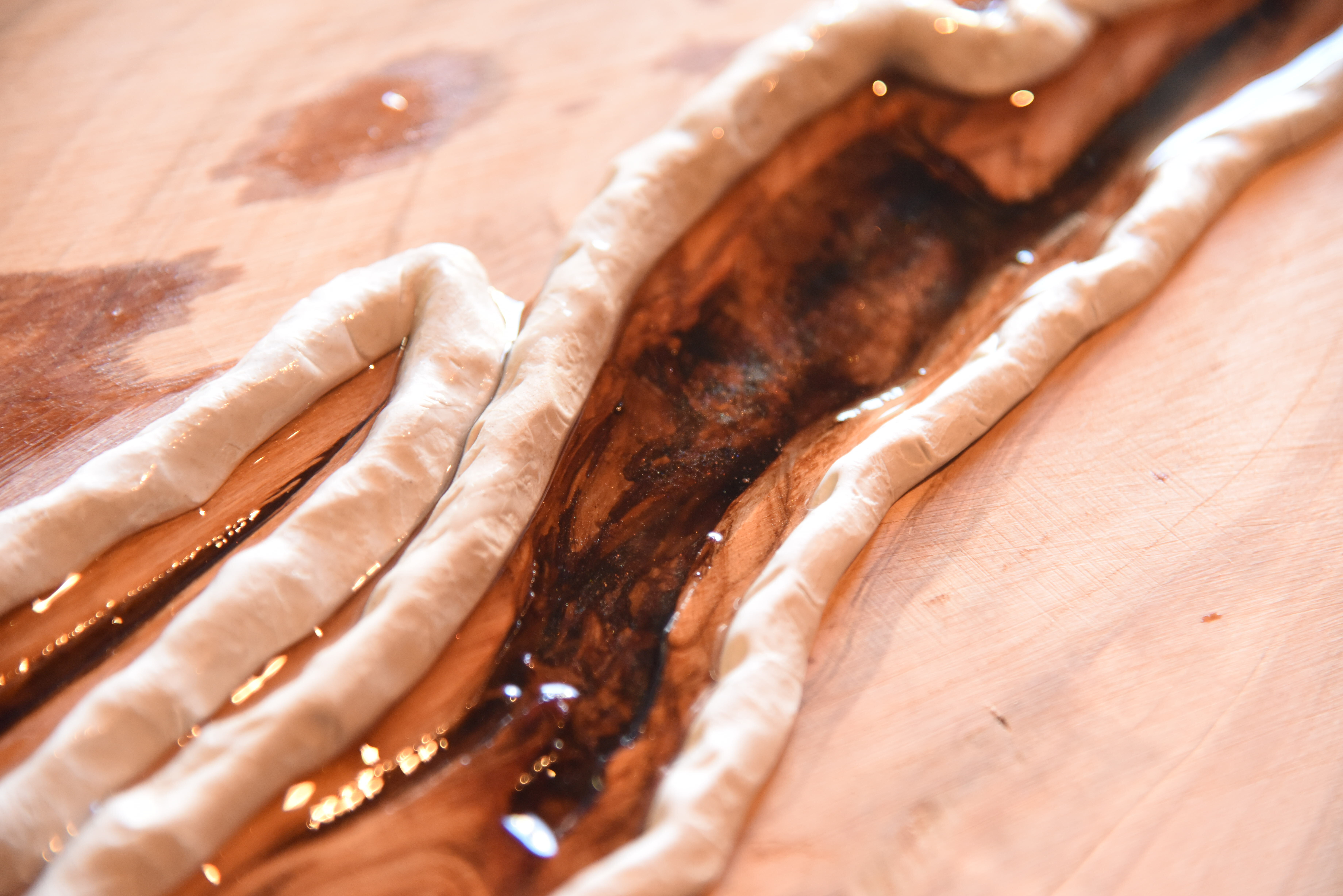 レジンは乾くと少し凹んでしまうので、粘土で土手を作り、少し上まで流し込みます。レジンは大豆由来の素材で無色透明です。少し色を入れたいなとブラウンやメタルの粉で琥珀をイメージして着色して流し込みました。