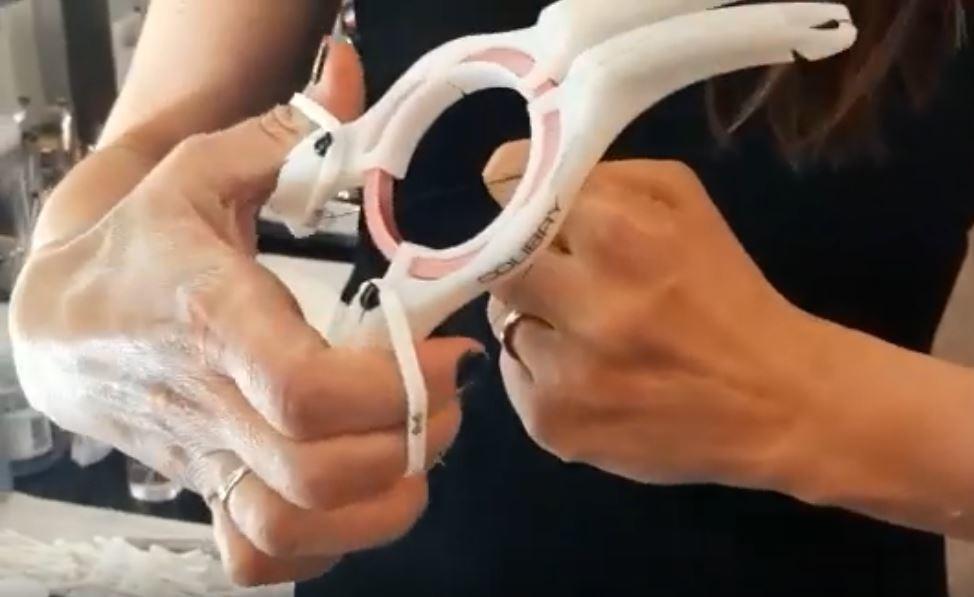 Colibryは片手でも使用できます。最初はある程度の練習が必要ですが、Colibryのアームのゴムバンドに指を通し使用します(非常に簡単に挿入することが出来ます)