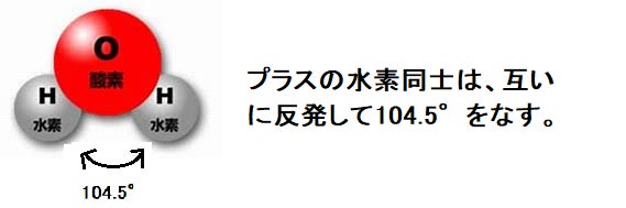 水に石鹸の遠赤外線をあてると、水の酸素と水素が微弱に振動し、水素が自由に位置を変えられるようになり、水分子は反発角度の104.5°で安定します。
