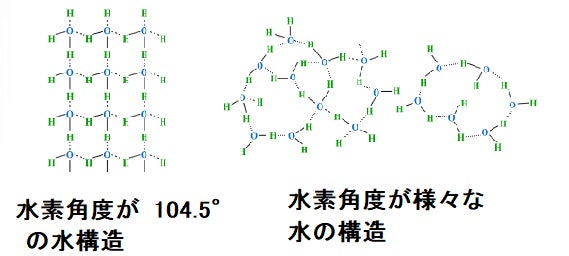 水の水素角度が104.5の水と、さまざまな水素角度の水とでは「水の分子構造・が異なり、特にその影響は「海面活性力」に違いが現れます。