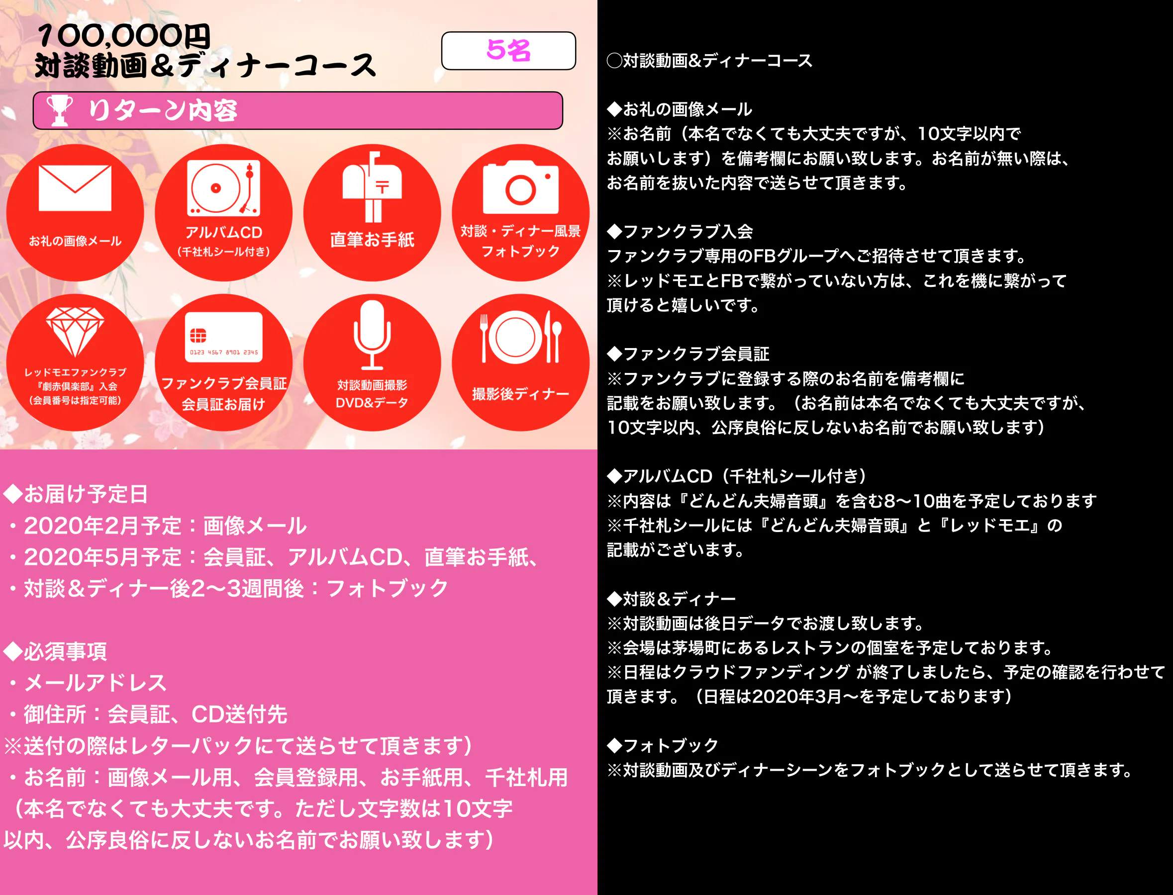 歌謡曲シンガー【レッドモエ】の作詞、作曲『どんどん夫婦音頭』を全国区にすべく、2020年から2022年に渡り最大10大都市ツアーを行います!私の声や曲を多くの人に届け、1人でも多くの人を笑顔にするために、皆様の想いと共にツアーを成功させていきます!!