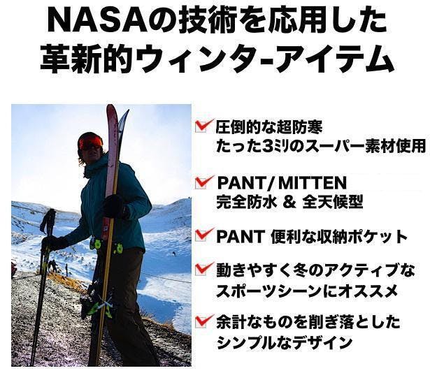 OROS社では、エアロゲルを特殊加工して、たった3ミリの生地"ソーラーコア"を独自に開発。宇宙科学で注目される素材を一般のアパレルに応用したのです。その結果、圧倒的な超防寒を実現しました。(ニット帽・ミトンは2ミリのソーラーコアを使用)