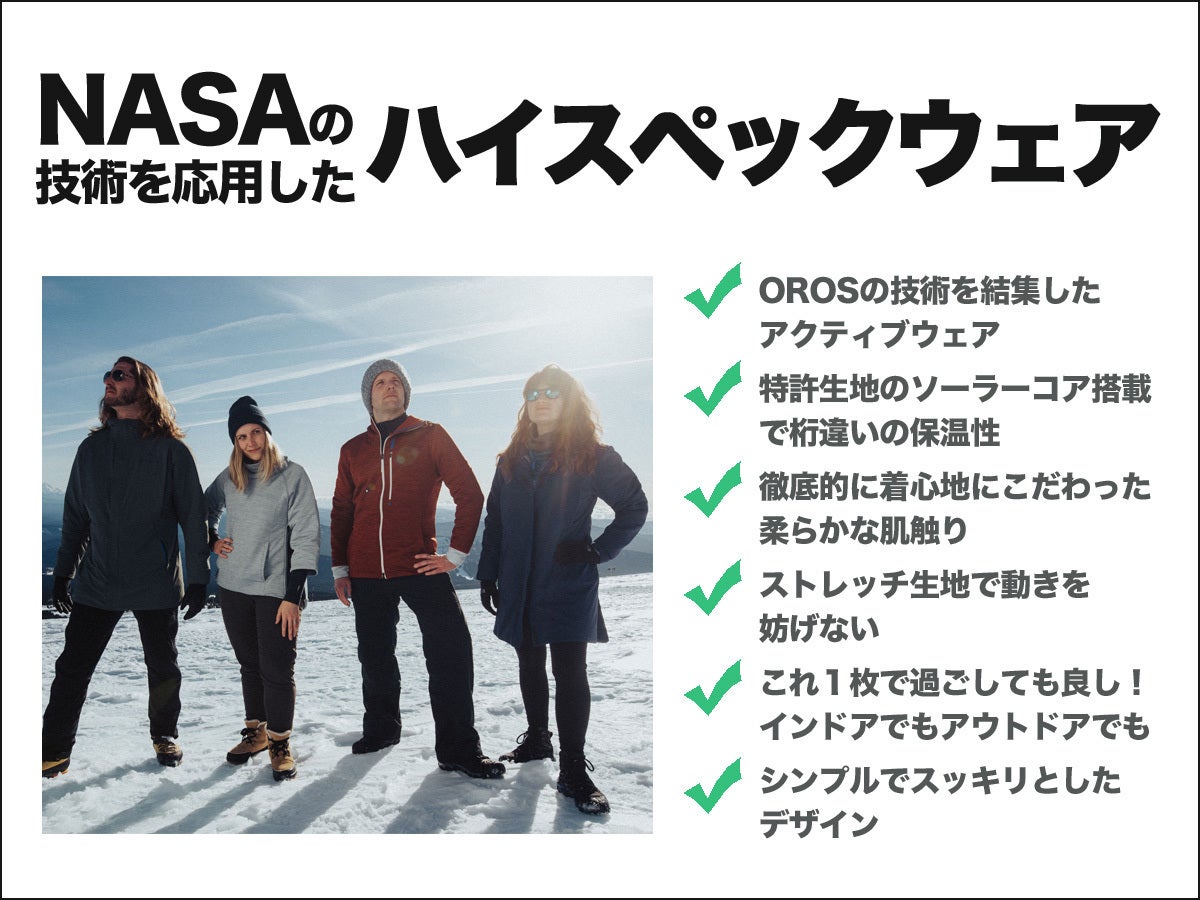 OROS社はアメリカに拠点を構えるブランドです。NASAの技術をいち早くアパレル分野に取り入れるなど、確かな技術力を誇っており、アメリカだけでなく世界中から愛されるブランドに成長しています。