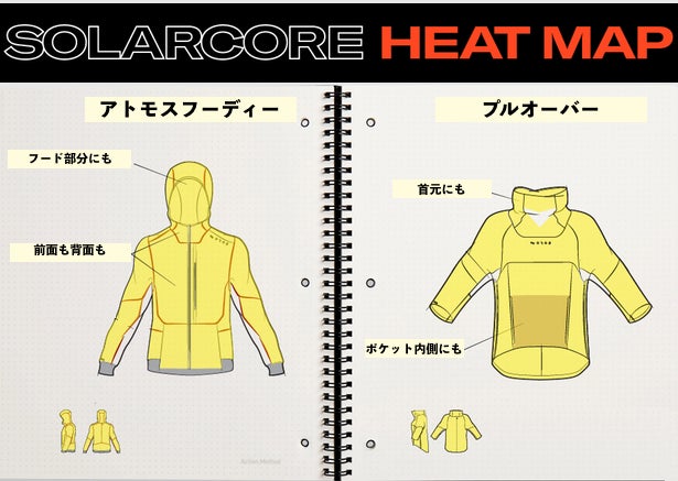 (ここに映っているのは前プロジェクトのORION PARKAです。今回のアトモスフーディー・プルオーバーにも部分的にソーラーコアが同様に使用されています)