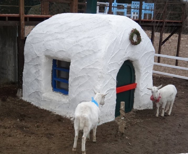 ヤギや鶏は、ヤギにも詳しい加勢牧場のガンジー加勢さんに手伝ってもらって、10万円以内で購入します。ちょうどアースバック工法で作ったヤギ小屋の写真が非電化カフェさんのHPにありましたので、お借りしてきました。