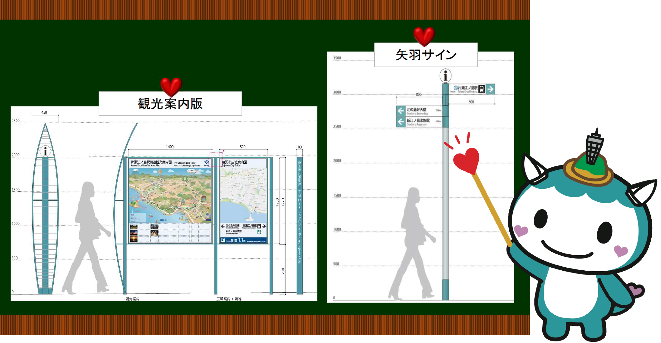 この観光案内サインは、小田急片瀬江ノ島駅から江の島をつなぐルートのほか、観光客が周遊できるような主要箇所を中心に設置するキュン♡