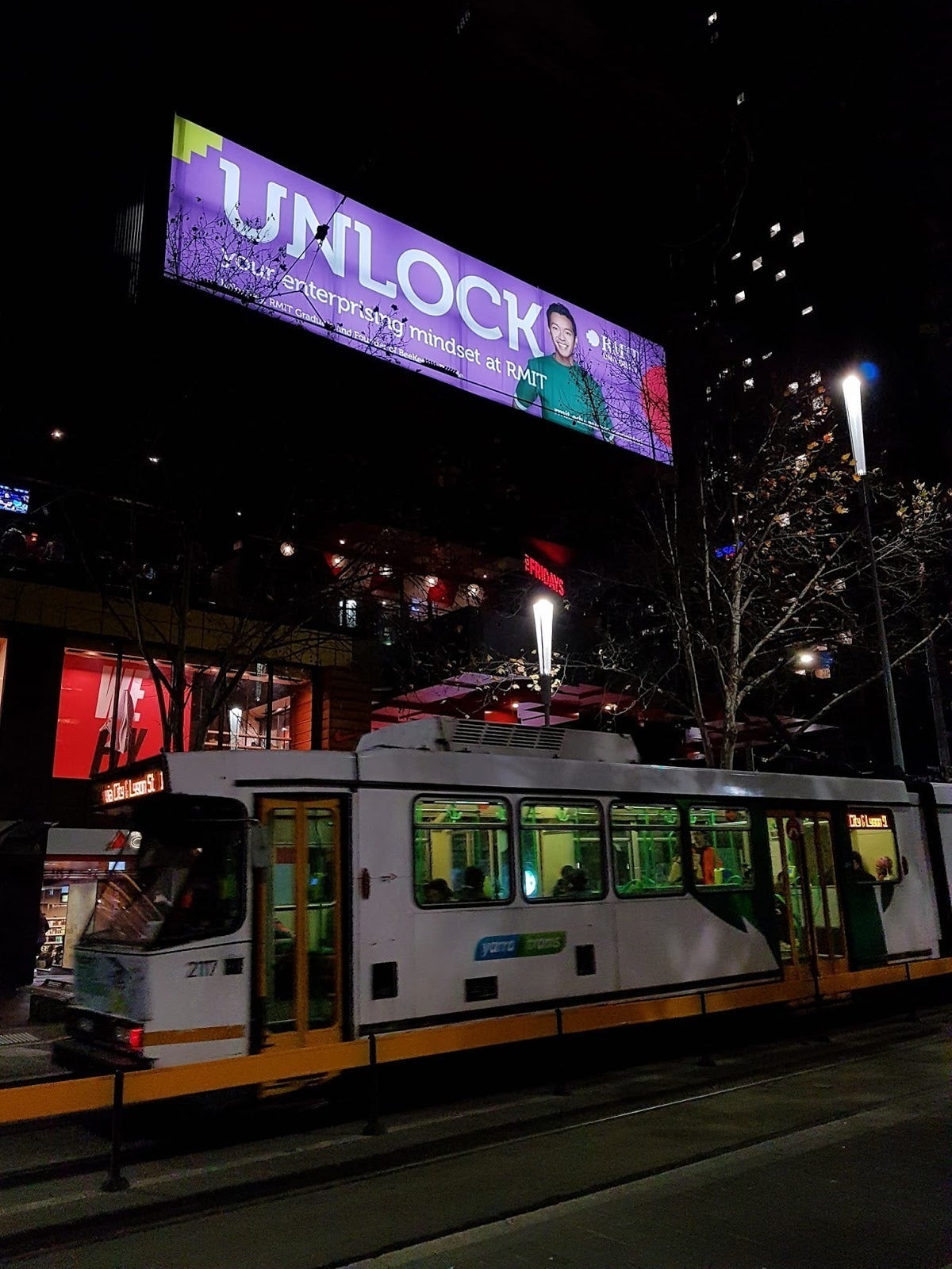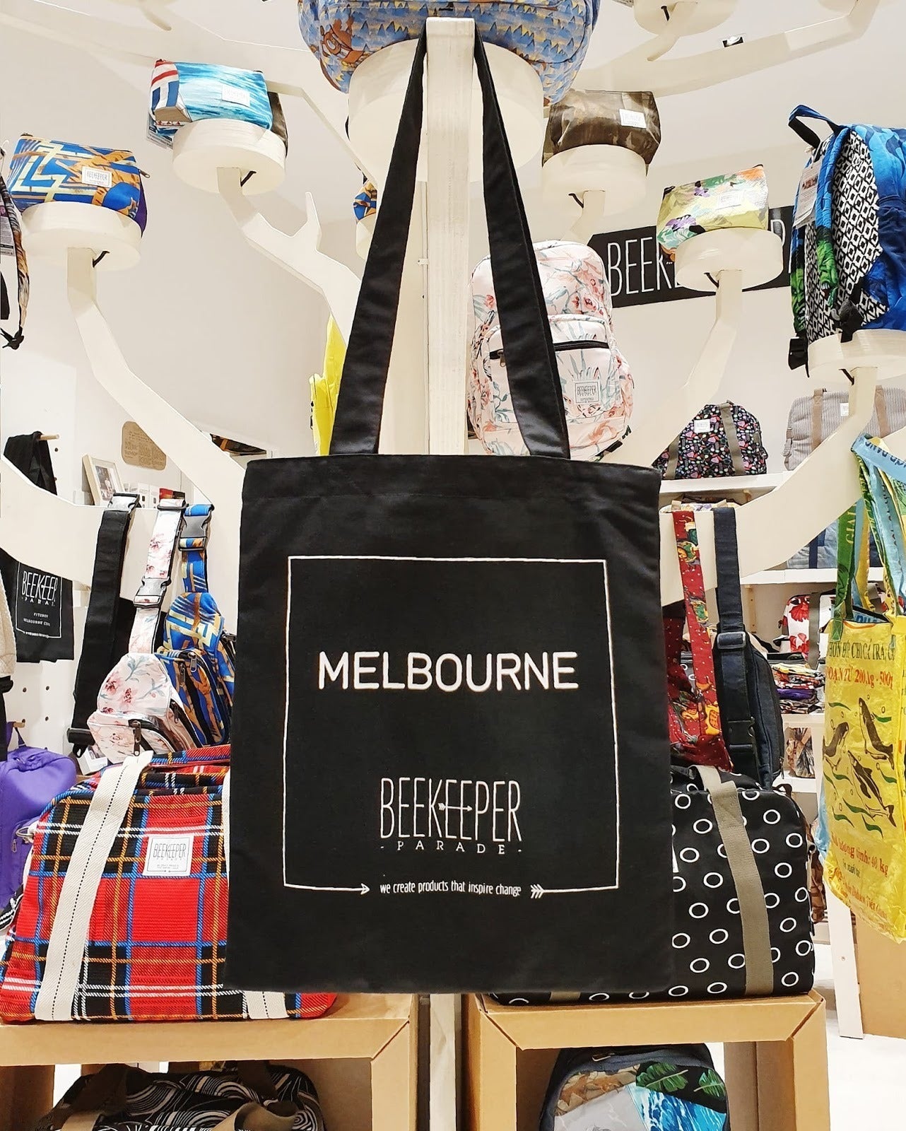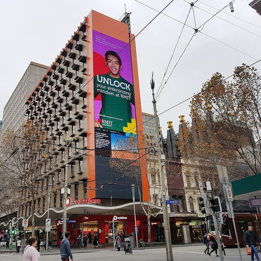 卒業生代表としてRMIT大学の広告に起用された時の写真です。店舗の入っているメルボルンセントラル(駅付随の商業施設)やメルボルンの大学、地元の人たちのサポートによってこれまでブランドは成長してきました。おかげさまでメルボルンを歩いていると、ビーキーパーのカバンを持っている人を見かけることが増えてきました。