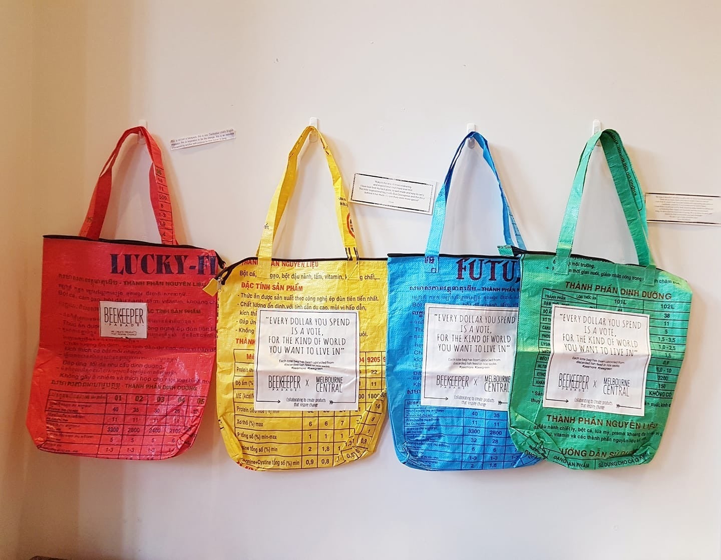 日本・カンボジア・オーストラリアを繋ぐ、世界を変えるお米袋再利用トートバッグです。