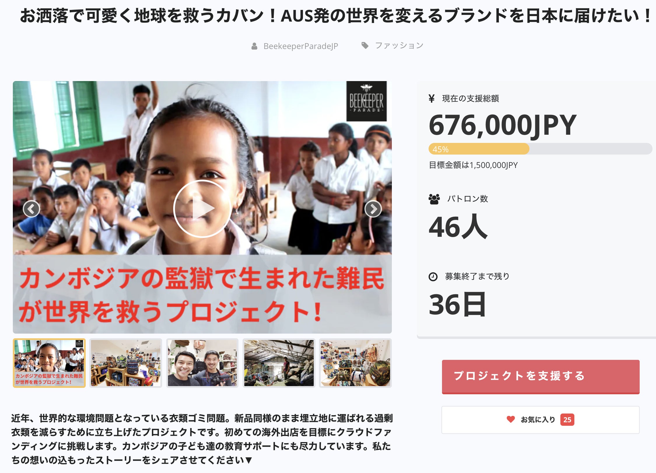 これまでにご支援をしてくれた皆さま、本当に感謝の気持ちでいっぱいです。ご支援をいただくとEメールで通知が来るのですが、その度に声を出して喜んでいます。笑そして嬉しすぎてスクリーンショットを撮っています。笑現在の活動報告です。◇現在集まっているご支援金額は676,000円。◇46人の方がご支援してくださっております。◇目標金額の45%分の金額となります。◇当クラファンキャンペーンは残り、あと36日間! もうすぐ50%!本当に皆さまのサポート無しにはここまで来れていません。ここからキャンペーンは中間期間に入ります。一般的にクラウドファンディングは中間期間がご支援が減り、見てくださる人もあまりおらず、そこを乗り越えられるかが重要な期間と言われています。どうか、今一度、皆さまのシェアや拡散をお願い致します!コーキィの想いや、ブランドの存在する想い(地球に負担のかかる衣類ゴミ問題への取り組みやカンボジアの子ども達支援など)たくさんの人にどうしても知って頂きたい想いがたっぷり込もったクラファン なんです。自分の発信力不足のために、目標金額に到達をしないということはなんとしてでも避けたいと思っています。皆さまからの応援メッセージもたくさん頂けて、とっても嬉しいです。一つずつ全て読ませていただきました。昔からの知り合いや、知り合いの知り合い、全く知らないけれどSNSなどでストーリーに共感してくださった人など、たくさんの皆さんと繋がることができて感激です。キャンペーンが終わるまで、どなたがご支援を頂いたのか、個人情報を見ることができないので全ての人を把握できていませんが、一人ずつ感謝の気持ちをお伝えしたいと思っています。【松本力(リッキー)の紹介】ここで日本側でビーキーパーの進出について、いつも相談に乗ってくれているリッキーのご紹介です。また、今回のクラウドファンディングのリターン品を発送担当をしてくれる人でもあります。以下、リッキーからのメッセージです。↓ビーキーパーパレードジャパン 日本展開サポートをしている松本 力です。私自身、オーストラリアのメルボルンとシドニーで2年間生活しておりました。友達も居ない地へチャレンジする事へ恐怖もなく、目標/目的に向けて、ただただ歩む日々でした。<現在はビーキーパーパレードジャパンのサポートの他に企業向けオリジナルワインの製造/販売や都内23区の定額定期配送などの事業を展開しております。>日本展開のサポートのお話をケントから頂いた時、ブランドビジョンや活動をする理由や想いに共感し、出来る全ての力を注ぎたい。と思い、これまで毎週のようにミーティング(テレビ電話)を重ねてきました。オーストラリアへ出発をした当時の気持ちを思い出し、新たな挑戦へのやる気を奮い立たされました。日本側の輸入について話し合ってきた内容は例えば、・製品の安全性の確保・流通について・事業展開について・プロモーションはどうするのか・デザインや企業との提携などなど、、私も本気で想うが故に、時には自分の考えをぶつけ過ぎて、オーストラリア側のビーキーパーを困らせてしまったり(笑)その分、自分にとってもたくさんの想いが込もったプロジェクトとなっています。今のところ、ビーキーパーパレードジャパンは開催中の当クラウドファンディング ” キャンプファイヤー ” と2020年春出店予定の” ポップアップショップ ” のみでしか買うことが出来ません。是非、ビーキーパーパレードのカバンをおひとつ使っていただきたいです!きっと私たちの想いが伝わると信じています。製作者→販売者→利用者→そして、子供達と循環出来る商品販売の仕組みを、皆様が可愛く・お洒落をすることでサポートしていただきたいです。また、皆様のご要望、ご意見を参考に日本限定デザインや日本人の使いやすいデザインの作成に取り組みたいと考えております。私自身もポップアップショップの店頭におりますので、是非お話しに来てください!皆様とお会いできることが楽しみです!引き続きご支援、ご支持、何卒、宜しくお願い致します(^^)松本 力Instagram: @Riki_Matsumoto以上、彼からの想いの込もったメッセージです。読んでくださってありがとうございます!これからも、キャンペーンは続きます!皆さまご応援をよろしくお願い致します。支援方法・リターン品についてなど不明な点やご質問がありましたらお気軽にお問い合わせください。Eメールアドレスはこちらです。beekeeperjapan@beekeeperparade.comもしくはインスタグラムやフェイスブックからでもメッセージを受け付けています。www.instagram.com/beekeeperparade_jp/www.facebook.com/beekeeperparadejp/感謝を込めてケントより