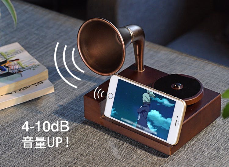 この「蓄音機風無電源スピーカー」を通すとエコー共鳴はなんと6倍!!どんな音でも、低音がずっしり染みるステレオ音に早変わり。