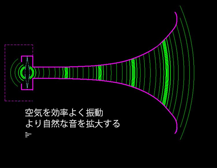 さらに拡声器のラッパ型は、徐々に広がる比率により他では出せない音の再生が可能に。