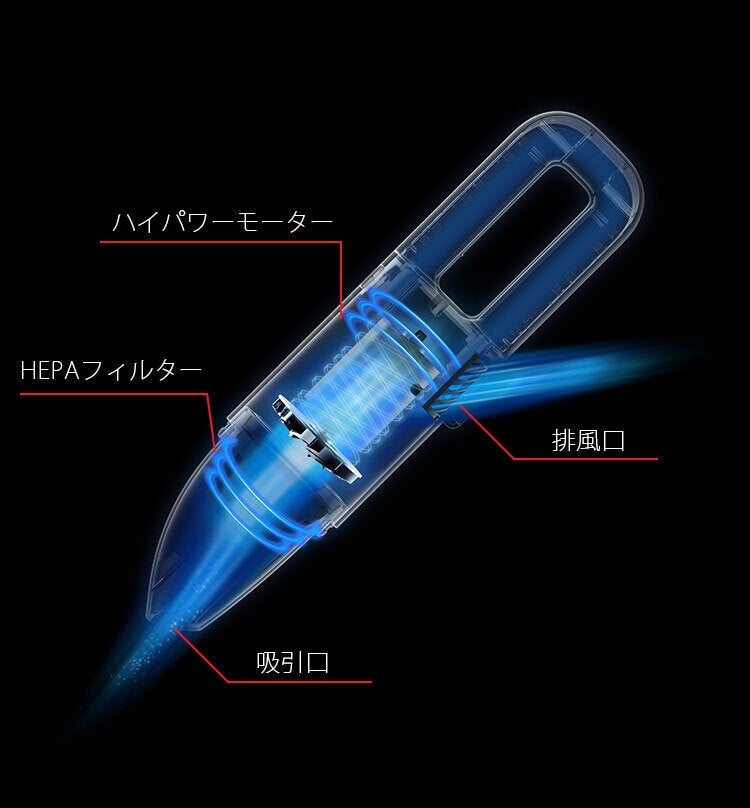 サッと簡単に取り出して使えるコンパクトさを完備しているので時間も手間もかからず、コスト費用も必要ありません。これからはわざわざディーラーに行かなくてもいつでも清潔!ペットの体毛や砂、小石は一瞬で吸い取ってしまう吸引力を兼ね備えているため、衛生面もバッチリ!全てのお悩みを解決する車載用コードレスクリーナーとして開発された優れたプロダクトです!