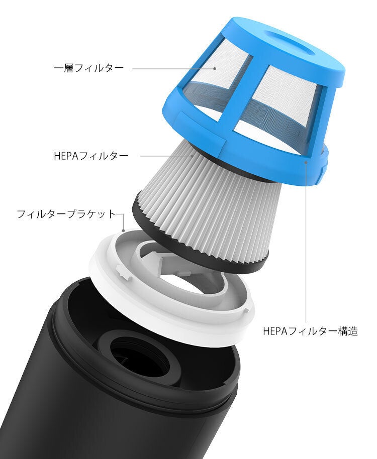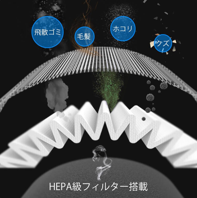 二重構造のHEPAフィルターを採用しました。一層フィルターで目に見えるゴミや残りかすを捕まえ、HEPAフィルターで0.3ミクロンもの小ささのほこりまで捕まえてくれるので取り残しはありません。