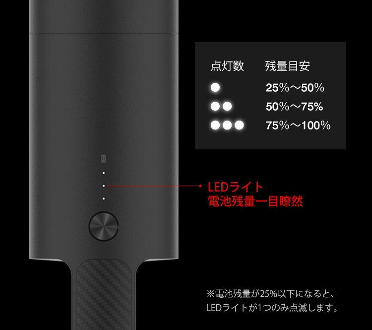 3段階LEDライト表示で電池の残量は一目見れば分かります。充電タイミングをが把握しやすくなります。