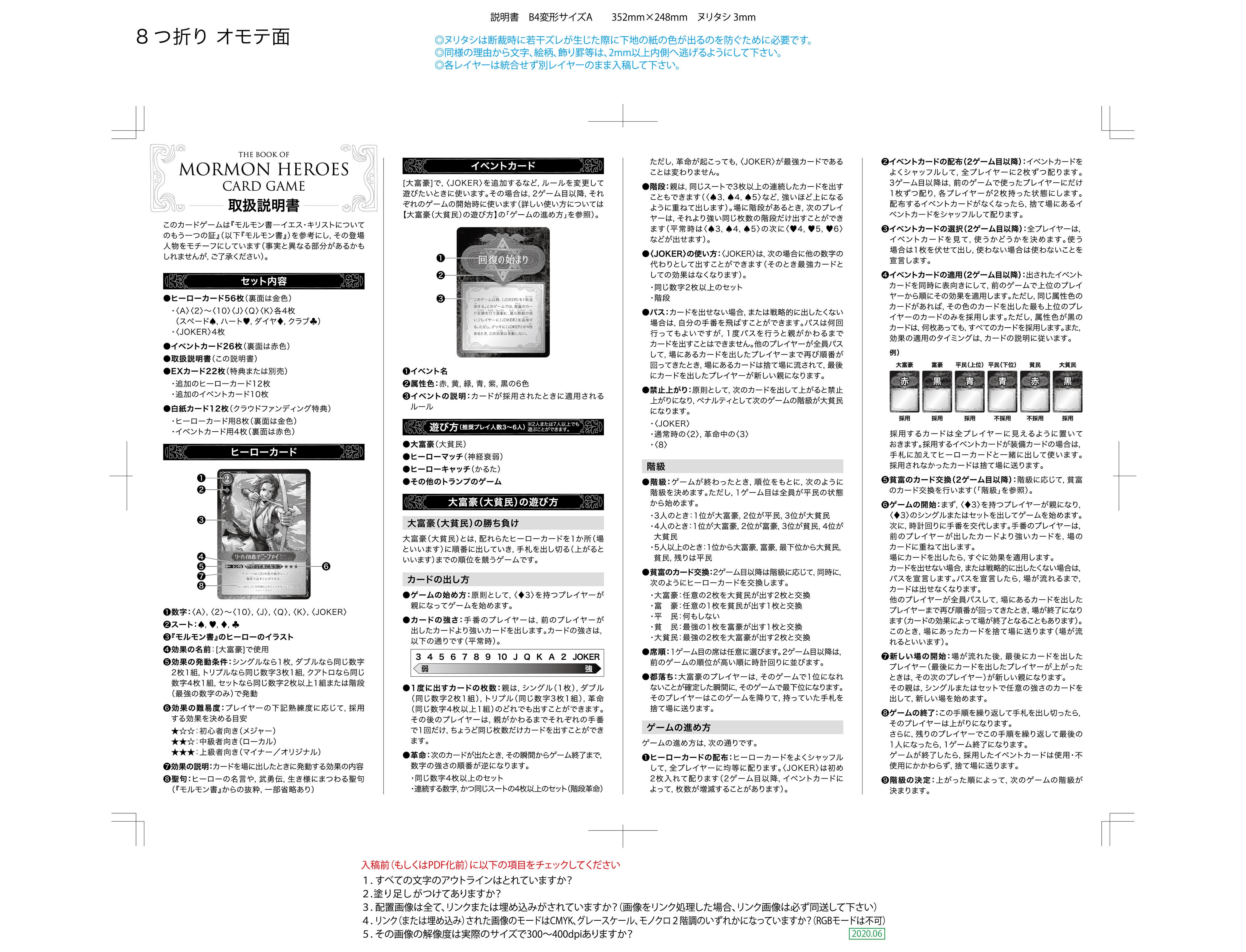2022/06/10 16:31支援者の皆さまこんにちは。 BoM Heroesスタッフです。先月末、ついに印刷業者への発注を完了いたしました。前回のご案内で4月には印刷の発注をかけるスケジュールとご報告しましたが、最終確認の際に発生した修正等の影響で遅れが生じました。度重なる遅延につきましてお詫び申し上げます。印刷業者から品が届き次第にはなりますが、皆様へのアイテムの発送は7月中になる見込みでございます。添付の画像は、本体セットに付属の説明書のオモテ面です。「大富豪(大貧民)」の基本的なルールからご説明しています。ウラ面には、カードに記載された言葉の参照聖句一覧や、ルールに関するQ&Aもございます。今後とも変わらぬご愛顧のほどを、心よりお願い申し上げます。BoM Heroesスタッフ一同 もっと見る