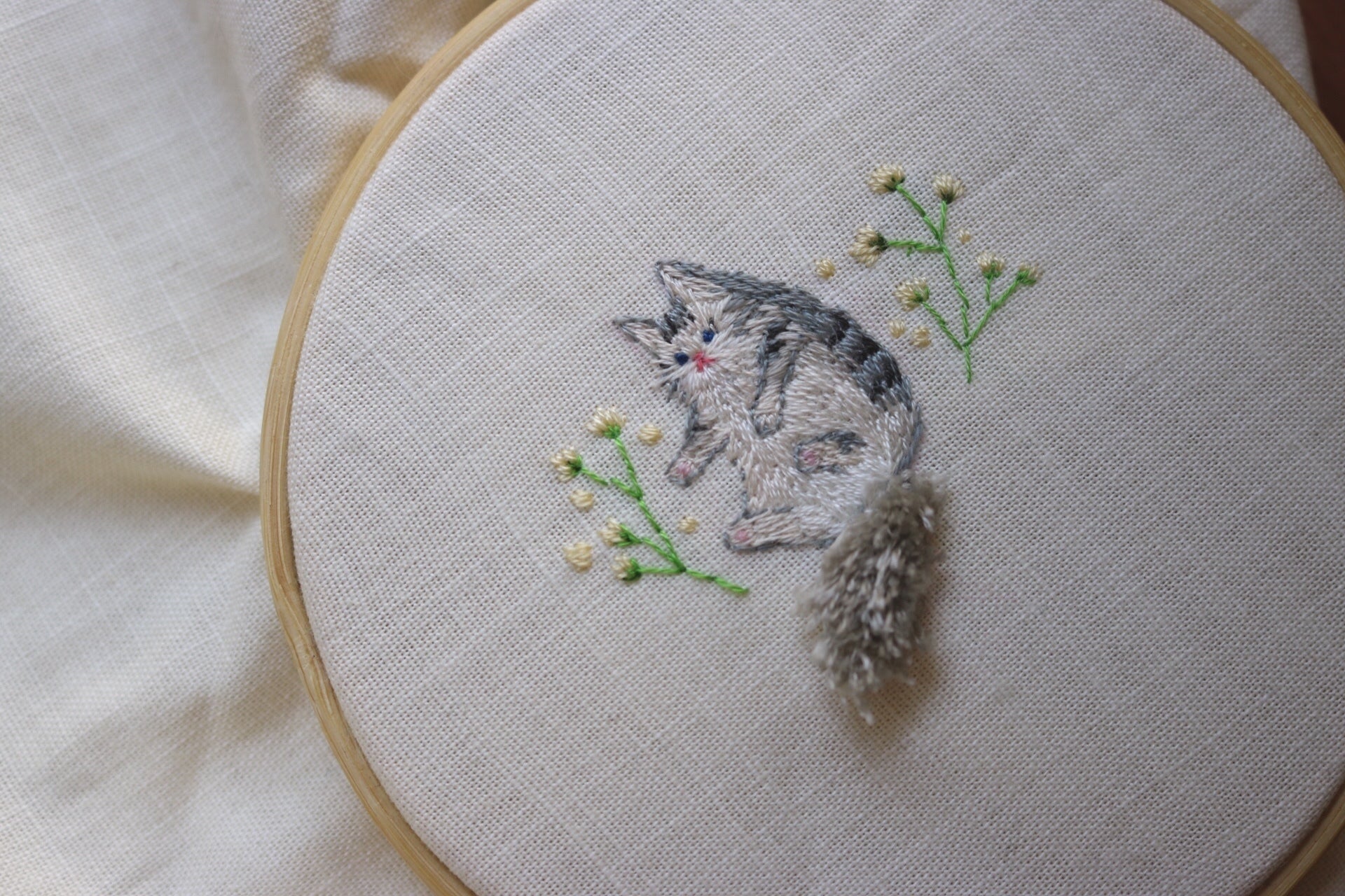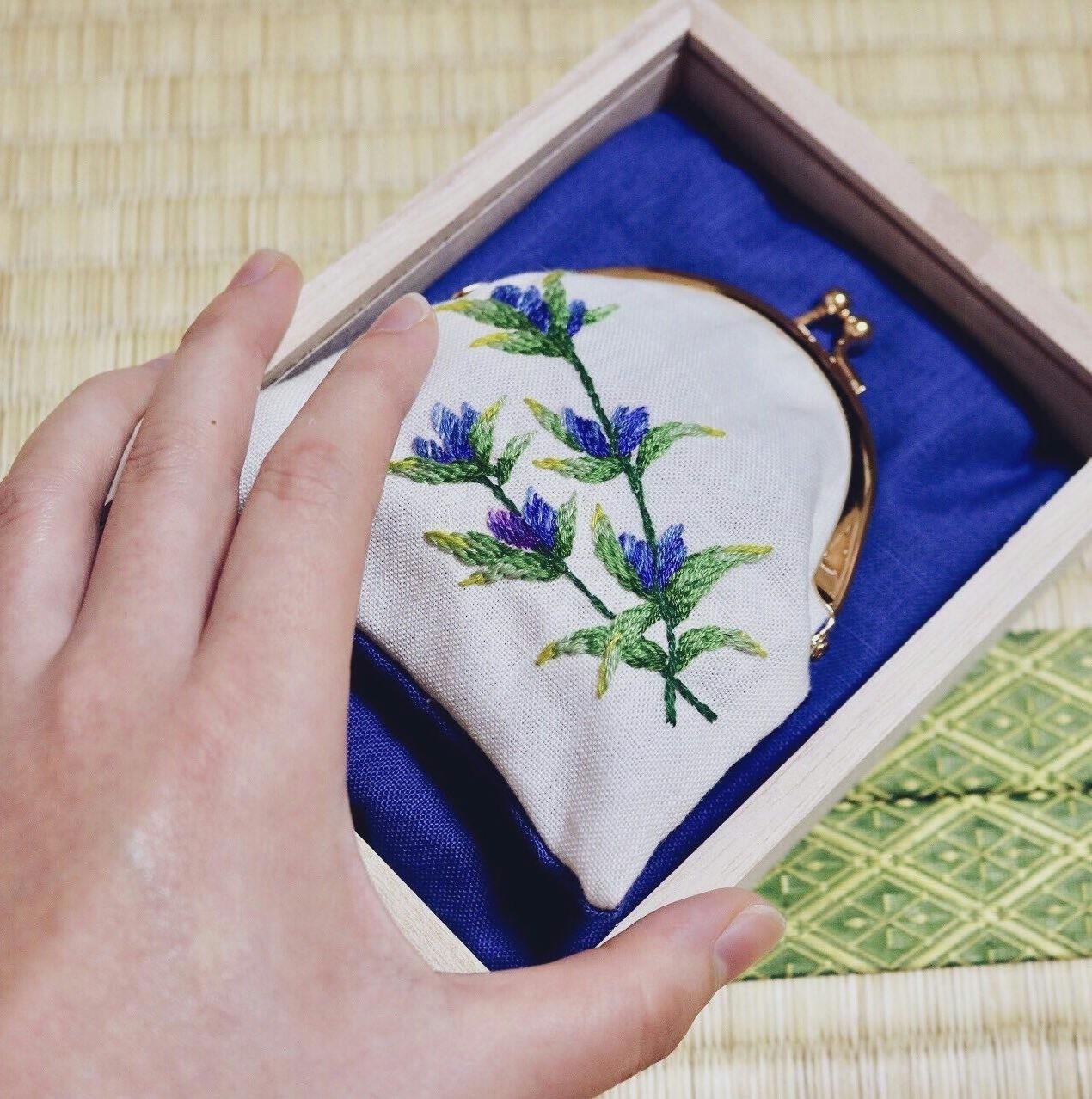 私は趣味をいくつかもっていて、そのうちのひとつが刺繍です。いろんなお花を、私がエコバッグやがまぐちに刺繍いたします。