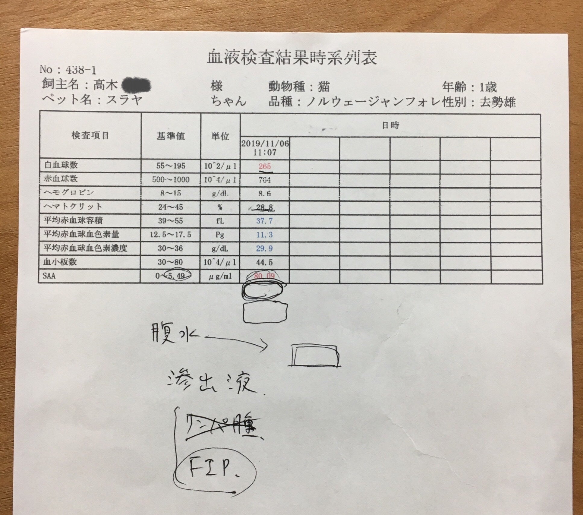 蛋白分画、腹水の遺伝子検査でも、FIP陽性という結果でした。