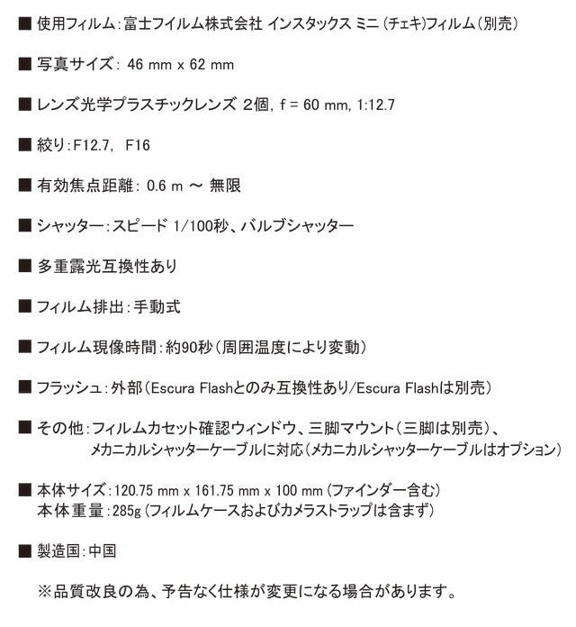 他のインスタントカメラに比べて無駄な機能を完全に排除しているため、見た目はスタイリッシュで携帯性が高い仕様になっています。シャッターの切替えもフィルムの巻取りも手動の完全アナログ式、電池を使わない完全手動式インスタントカメラです。