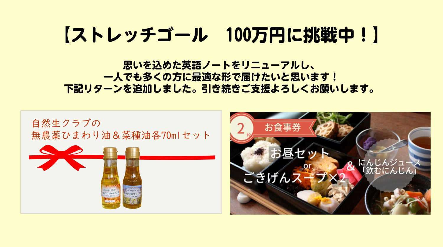 日頃お世話になっている団体さんにお声がけさせていただき、下記2つのリターンを追加しました!「ノートは要らないけど、これなら…」という方にも、是非お勧めしたい内容です。