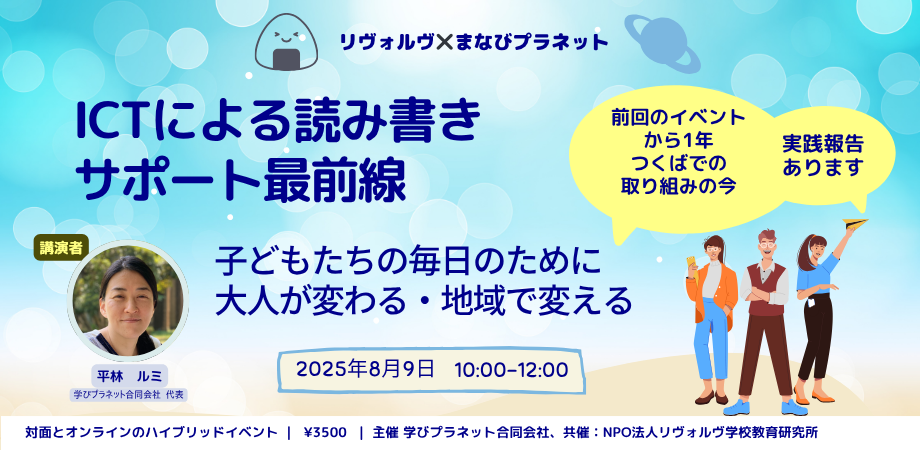 梅雨が明けて、いよいよ夏本番ですね。毎日暑い日が続いていますが、みなさまいかががお過ごしでしょうか。さて、この夏、学びプラネットさんとのコラボ講座を企画しました!日々 子どもたちと接する中で、「読み書きが苦手だからといって、勉強ができないわけではない」、「人にはそれぞれ学びやすい学び方がある」ということを実感しています。学びプラネットさんでは、「周りのみんなとは少しちがう学び方をしたい子どもが自分の学び方を見つけるための学びの場をデザインする」という理念を掲げて活動していらっしゃいます。私たちは、学びプラネットさんの理念と活動に共感し、ICTによる読み書き支援プログラムを実施するなどしてきました。今回は、学びプラネットさんからICTによる読み書きサポート最前線 と リヴォルヴから「まなぷらキッズ」の取り組みをご紹介します。オンラインでも参加できますので、ぜひご参加ください!ーーーーーーーーーーーーーーーーーーーーー日時:8月9日(土)10:00〜12:00 ※ハイブリッド実施場所:むすびつくば ライズ学園(つくば市吾妻1丁目10−1 つくばセンタービル 1F)主催:学びプラネット合同会社 / 共催:リヴォルヴ学校教育研究所定員:会場参加30名、オンライン参加最大100名イベント詳細・参加申込ページ:https://tsukuba0809.peatix.com/ーーーーーーーーーーーーーーーーーーーーー★ 同日の午後には、子ども向けのワークショップ体験会「デジタルシーカーになろう」があります。ICTを筆記用具として活用する方法を、遊びも交えながら楽しく学べる講座です。体験会詳細ページ:https://peatix.com/event/4489362/view