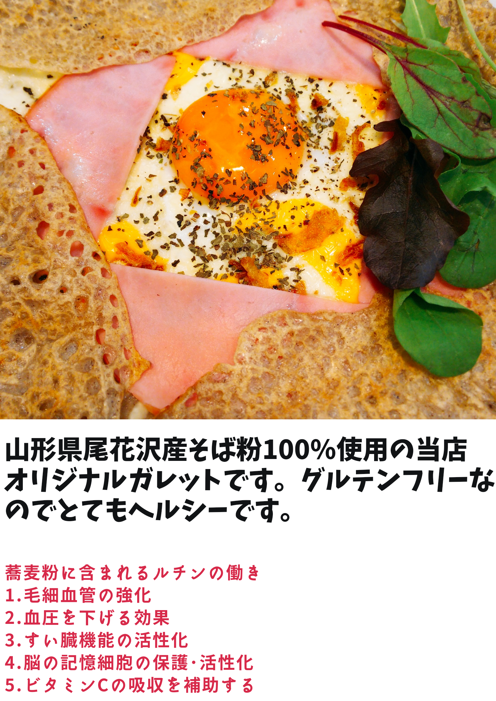 蕎麦で有名な山形県尾花沢産蕎麦粉100%を使用し、『そばがき』からヒントを得て改良し完成したガレットです。ガレット屋さんでは珍しいキッチンとしてのメニューも朝から手作りで仕込みをしております。銀山温泉の近くの道の駅や大正ろまん館に野菜やお米を提供している農家(旦那の実家)から仕入れしているので、野菜などは新鮮で美味しいです。コンセプトは誰でも入りやすいオシャレ過ぎないガレット屋さんです。
