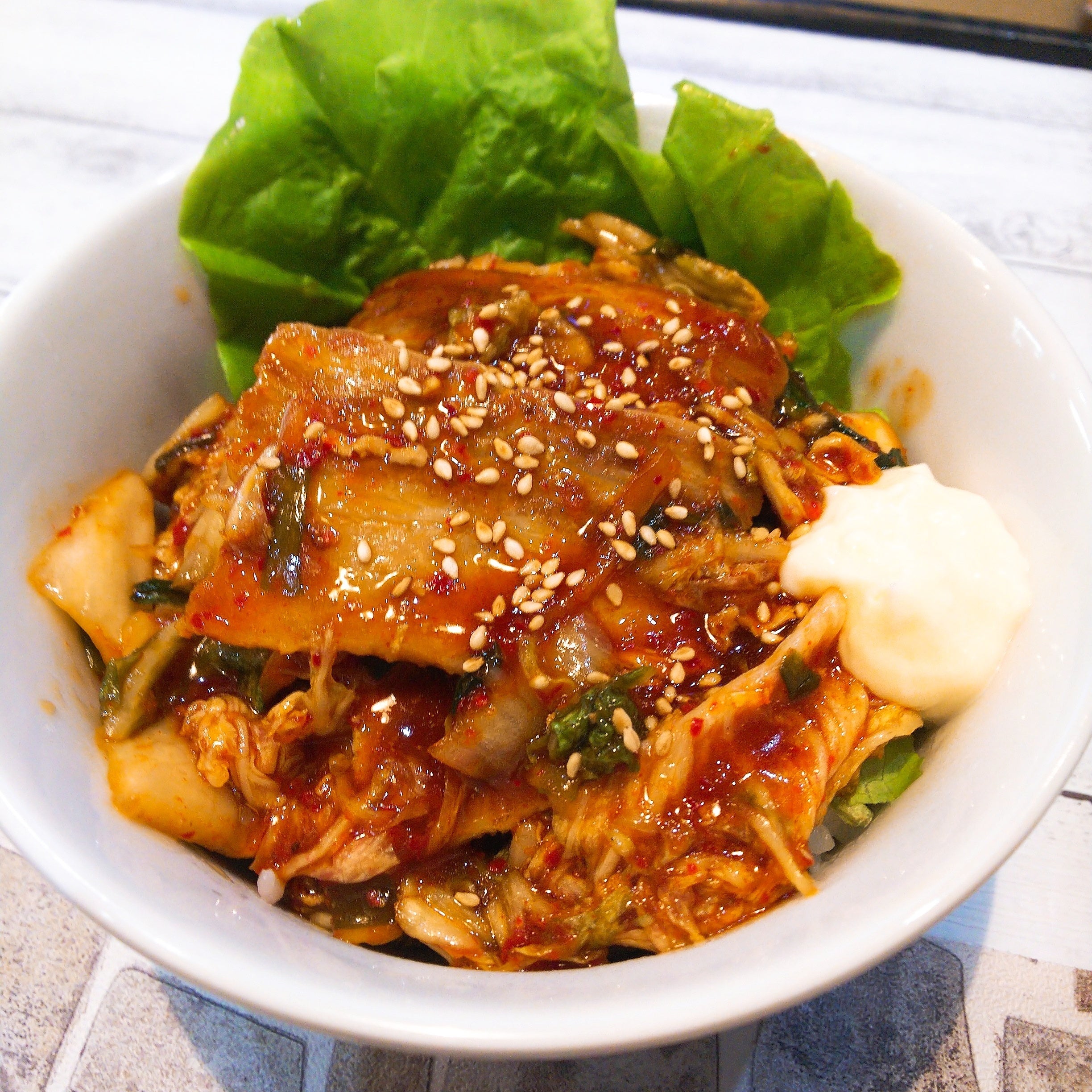 鉄板で焼いた豚キムチ丼(サラダ、芋のこ汁、ドリンク付き) 770円
