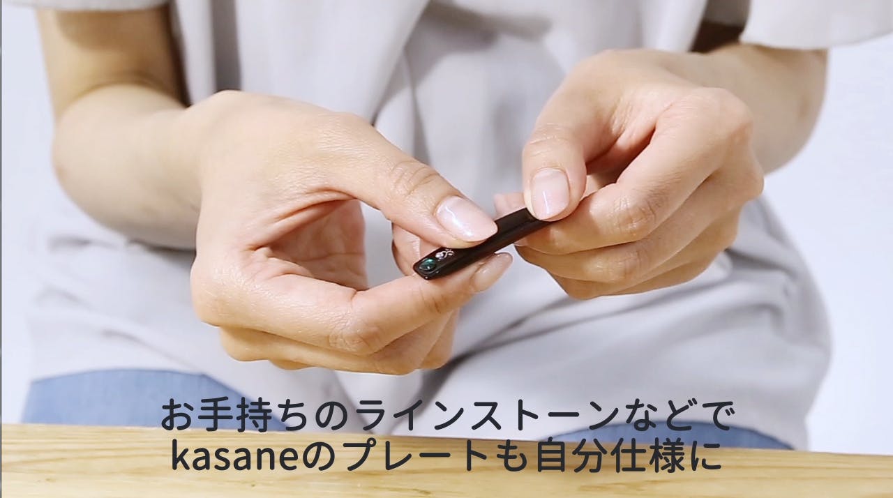 kasaneはテンプル部分に「装飾が施されたプレート」をスライド脱着させるという構造となっております。これにより、本体となるフレームを一本所持しておけば、追加でプレートを好きに付け替えて、自分の