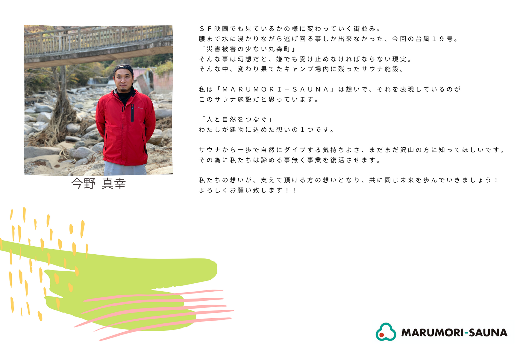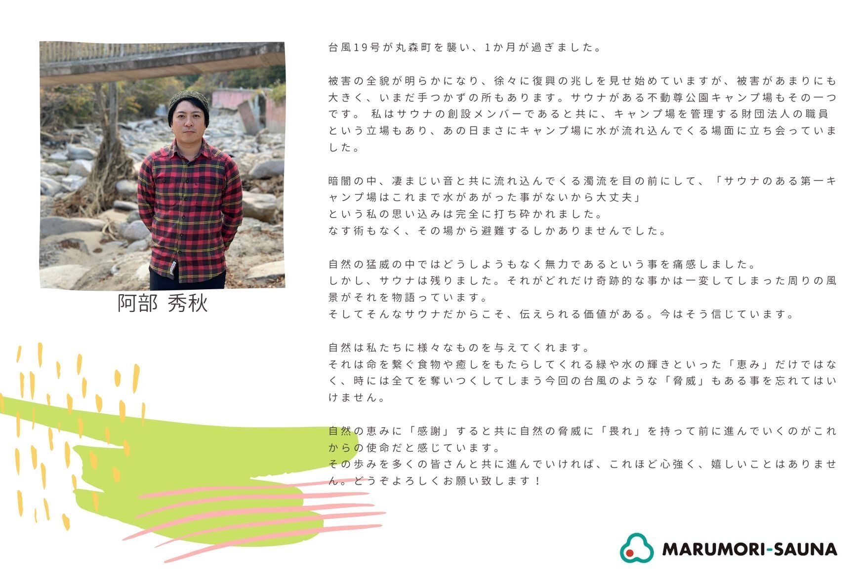 設立メンバーと同じ熱量で、この場所やMARUMORI-SAUNAに関わる人たちを愛してやまない人々がたくさんいるのだ!というメッセージを、台風の被災以降に少し元気を無くしているMARUMORI-SAUNA設立メンバーへ、目に見える形で届けたいと思っています。