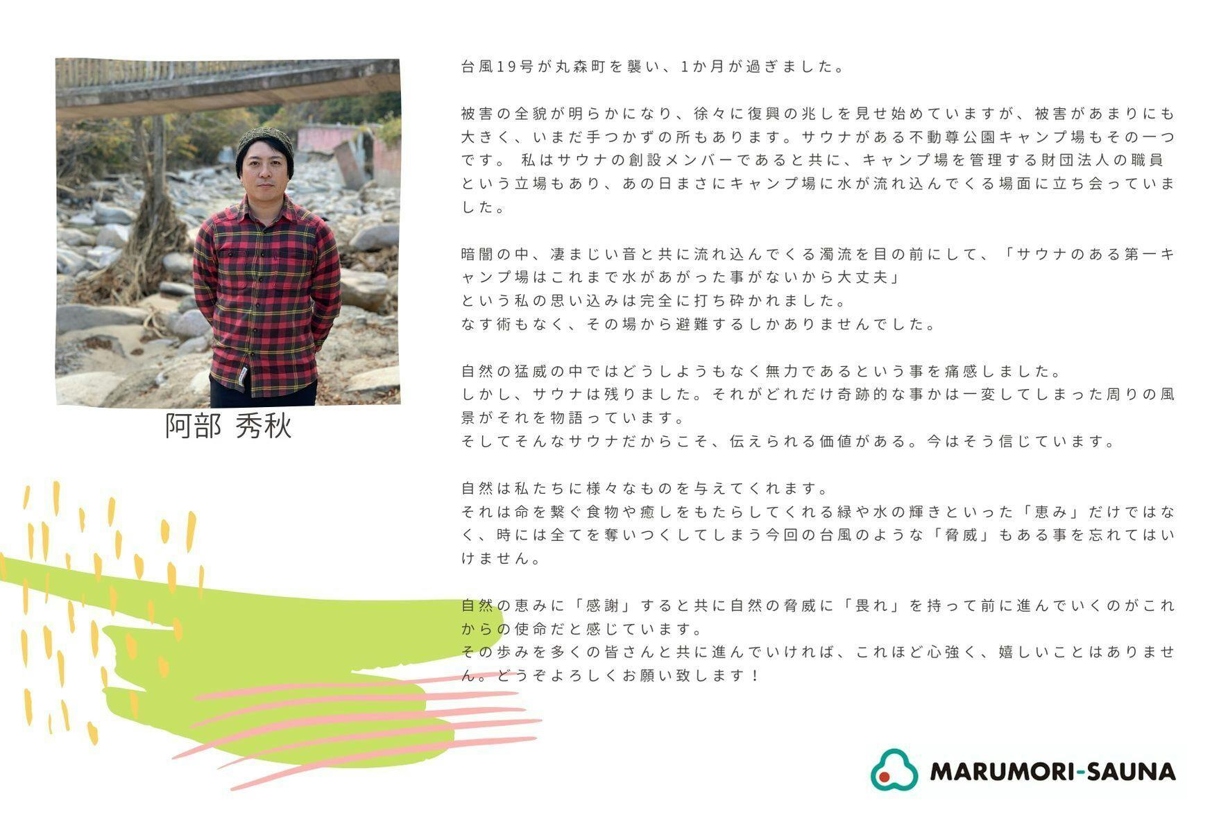 MARUMORI-SAUNAがあるキャンプ場も大きな被害を受け、営業再開の目処が立っていないキャンプ場の被害が甚大であり営業できる状況ではないため、現在キャンプ場は休業中です。それに伴いMARUMORI-SAUNAも営業休止しています。キャンプ場復旧の目処は立っておらず、MARUMORI-SAUNAも同様に営業再開の目処は立っていません。