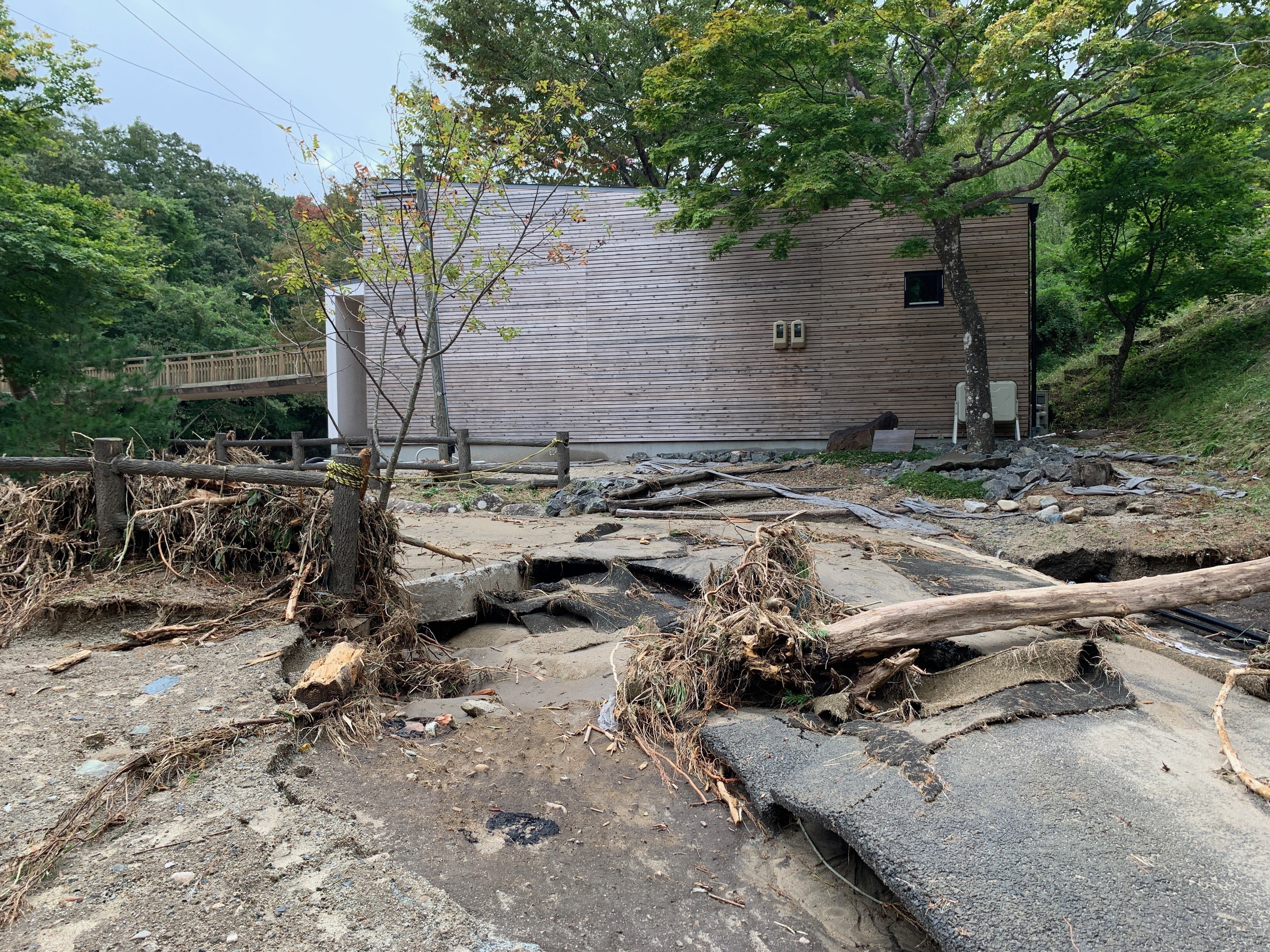 今回の台風により、このMARUMORI-SAUNAのあるキャンプ場は大変な被害を受けました。道路は陥没し、サウナ小屋の目の前の土地は消え、木々はなぎ倒されました。