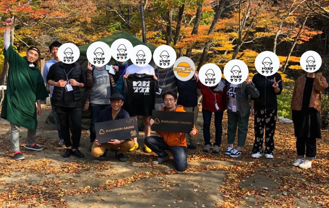 2018年11月に実施したTOHOKU SAUNA FESの際の集合写真私達は東北在住のサウナ愛好家の集団で現在は9名で活動しています。住んでいる場所は宮城、福島、山形、岩手と離れています。然し、各々の生活の傍にあるサウナを愛し(行き) 、催し事があれば集っております。2018年の晩春に開催されたEarth Day Tohoku でMARUMORI-SAUNA のオープン情報を確かめる為、錦町公園に集まったのが懐かしいです。その後は、ZINE やトークイベントでMARUMORI-SAUNA を紹介や利用させて頂く事で丸森の自然の豊かさ、環境の素晴らしさに触れる事が出来ました。