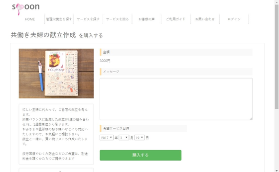 2017/03/19 14:35デモサイトにはなりますが、こちらが管理栄養士のサービス購入ページです。 こちらは、管理栄養士が家庭の献立作成をするサービスになりますが、他にも妊婦専門の代行調理や、健康診断の栄養サポートにダイエットサポートなど、各種管理栄養士によるサービスがこのようなかたちで、ネット購入できます。 こちらのページで、気になるサービスの詳細を見て、価格を見て「私、これお願いしたいわ!」と思ったら、緑色の購入するボタンを、ポチッと押すと購入できるようになります。 こちらから、担当の管理栄養士にメッセージで相談することも出来ます。 できる限り、みなさまが簡単にサービスをご利用頂けるように考えております。 利用方法が難しいのは、私自身が苦手ですので…(^-^; 他のページもどんどん仕上げていきますので、またご紹介します! もっと見る