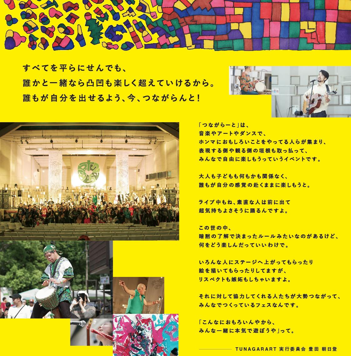 発達障害者支援法と言う法律ができ様々な支援も行われてはいますが、生きづらさは、変わらず多くあるのが現状だと感じています。すべてを変えることはできないですが、僕たちにできること、やりたいことが目の前にあり、仲間や、リアルなつながりがあれば、何でもできるのではないか?音楽やアートでつながり、少しづつ何かが変わっていくのではないか、と思い、イベントを企画しました。2014年9月、多くの人にサポートしていただき第1回「つながらーと」を開催することができました。生の音楽、生のアートを感じそれぞれが自由に楽めるイベントになり、多くの方に喜んでいただけました。