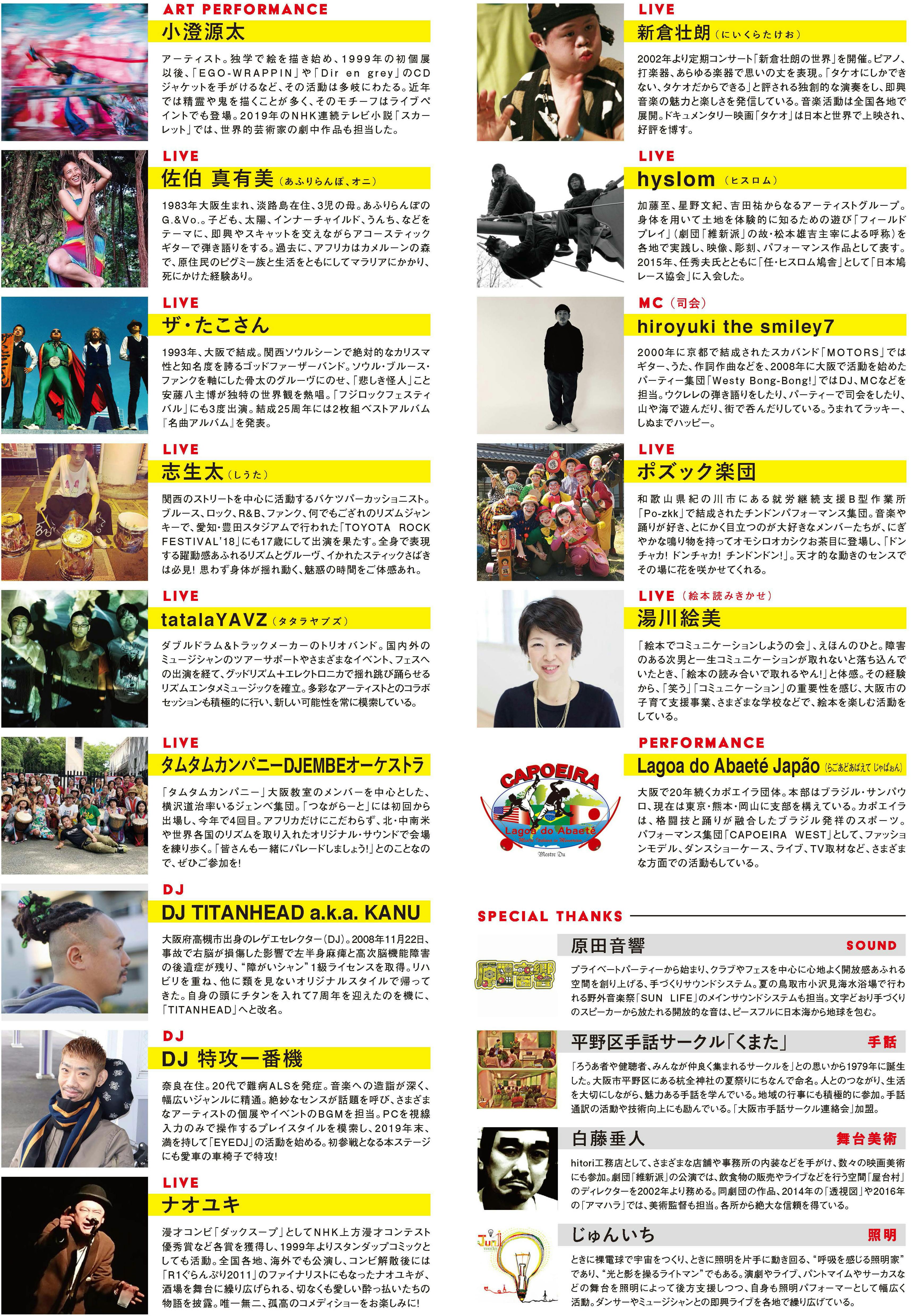 青木拓人/AFRA/IKTUARPOK/大阪チャチャチャバンド/紙芝居屋のガンチャン/佐伯 真有美(あふりらんぽ、オニ)/ザ・たこさん/志生太/タムタムカンパニーDJEMBEオーケストラ/ナオユキ/新倉壮朗&大阪マライカ/hyslom/ポズック楽団/湯川絵美/