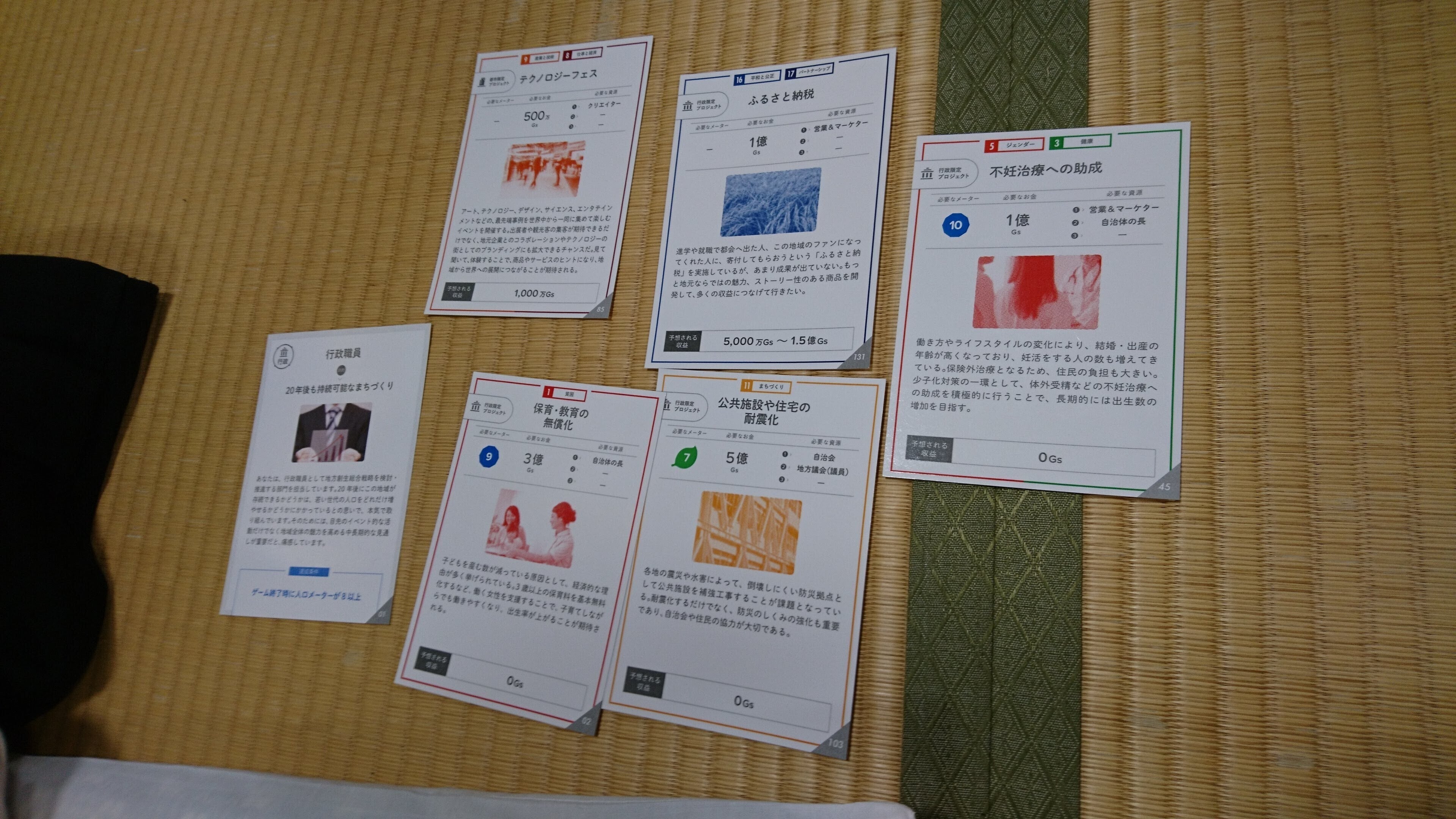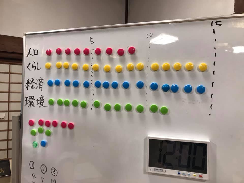 設定は、中山間地域にあるある自治体の行政職員、住民となってそれぞれのミッションを達成するべく、またその自治体の課題解決や、発展を目的に、12年(12分〈=3年〉×4セット)をプレイする、というものでした。