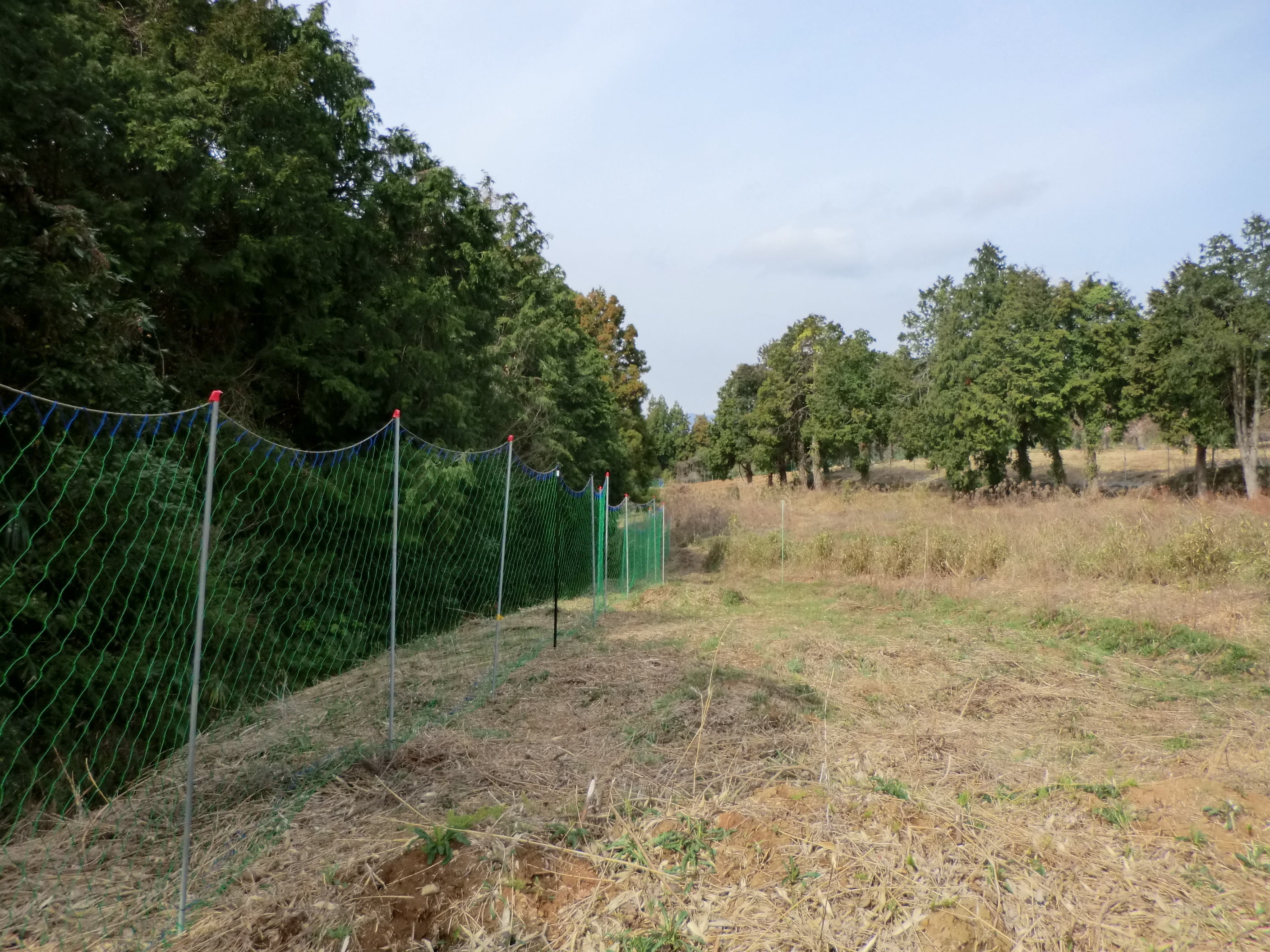 鹿・猪防護ネット設置完了のご報告。防護ネットを設置するまでの下準備にかなり時間が掛かってしまいましたが、鹿・猪の防護ネットの設置が3月10日に完了しました。設置後は毎日出現していた鹿を見ることが無くなりました!当初の予定では455mの設置予定でしたが、足らずに約50m距離が伸びました・・・畑が広いのと、設置場所が広範囲なので写真ではわかりにくいのですが、写真左の杉林沿いを通って奥に薄っすらと映っている杉の手前を通り、ぐるっと畑を囲っております。(写真が一枚しか掲載できないので、後日自分のFacebookに載せたいと思います。)今年は暖冬で雨も多く、なかなか思うように進まなかったのですが、なんとか春に間に合って良かったです。現在はネットの設置、圃場の整地が終わりブルーベリーの苗の植え付けをしています。この植え付けの作業が安心してできるのもネットが設置できたお陰です。今までは鹿に枝を食べられたり、イノシシに土を掘り起こされて苗が土から抜けたり、そんな被害も多々ありました。今年もブルーベリーの畑を全面草刈りしたのですが、畝の部分はあえて草刈りをしませんでした。これはセイタカアワダチソウなどの雑草でブルーベリーの苗が鹿に判別できなくさせる苦肉の策です。肥料も使わないので、初期の成長は遅くやっと大きく育てた苗を食い荒らされていましたので・・・植え付けが終わり次第、残した雑草も刈って太陽の光が当たるようにしてあげたいと思います。皆様にご支援をいただいたことで、まず一つ大きな難題を乗り越えることができました。本当にありがとうございました。今年は春の訪れも早く、やらなければならないことが山積みですが、収穫期に向けて頑張ってまいりたいと思います。まだこれからリターン品の収穫発送などもありますので、またご報告させていただきます。