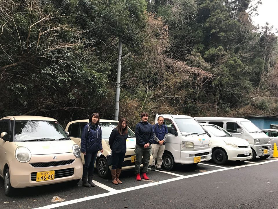 山形の車屋さん「サービスカーエムズ」のパワフルな女性スタッフの皆さんと、今回で運んだ車が5台目となるベテラン運搬ボランティアの渡辺さんが運んでくださいました。