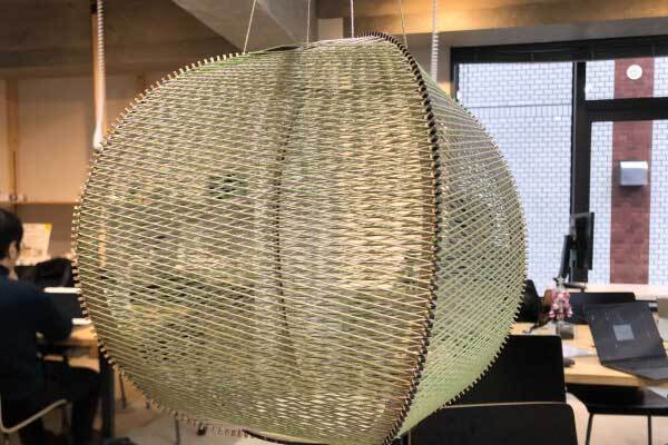 骨組みに糸を巻きつけて外装を作り、マイコンで制御できるLEDライトを入れました。