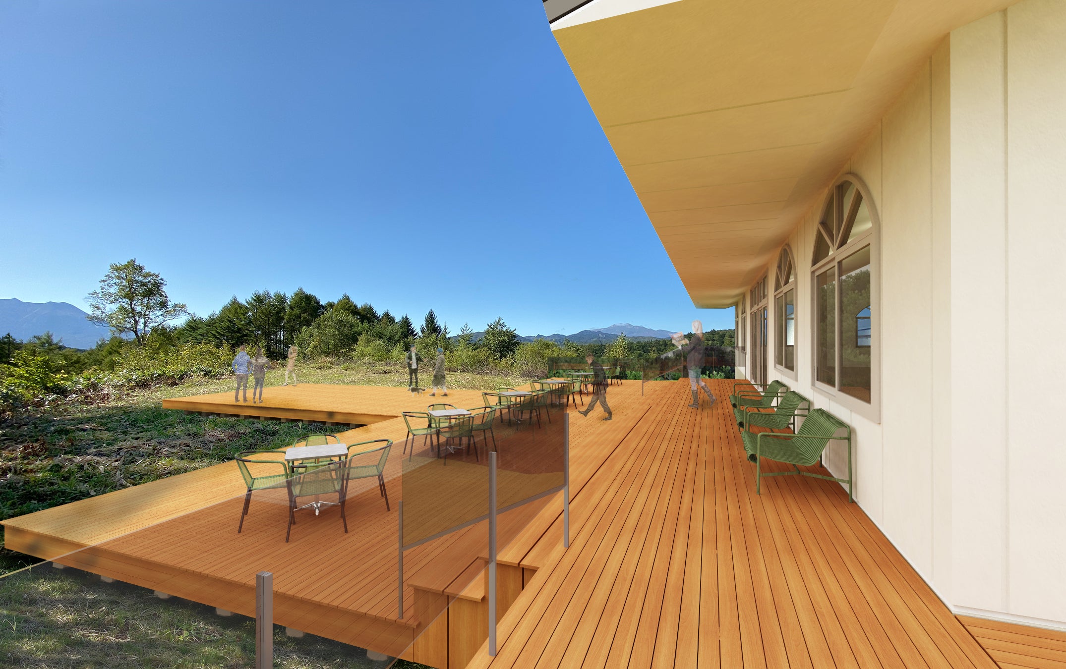 西にそびえ立つ「御嶽山」と南から頭を出す「木曽山脈」、ふたつを繋ぐようにウッドデッキが、レストランの外周を囲みます。