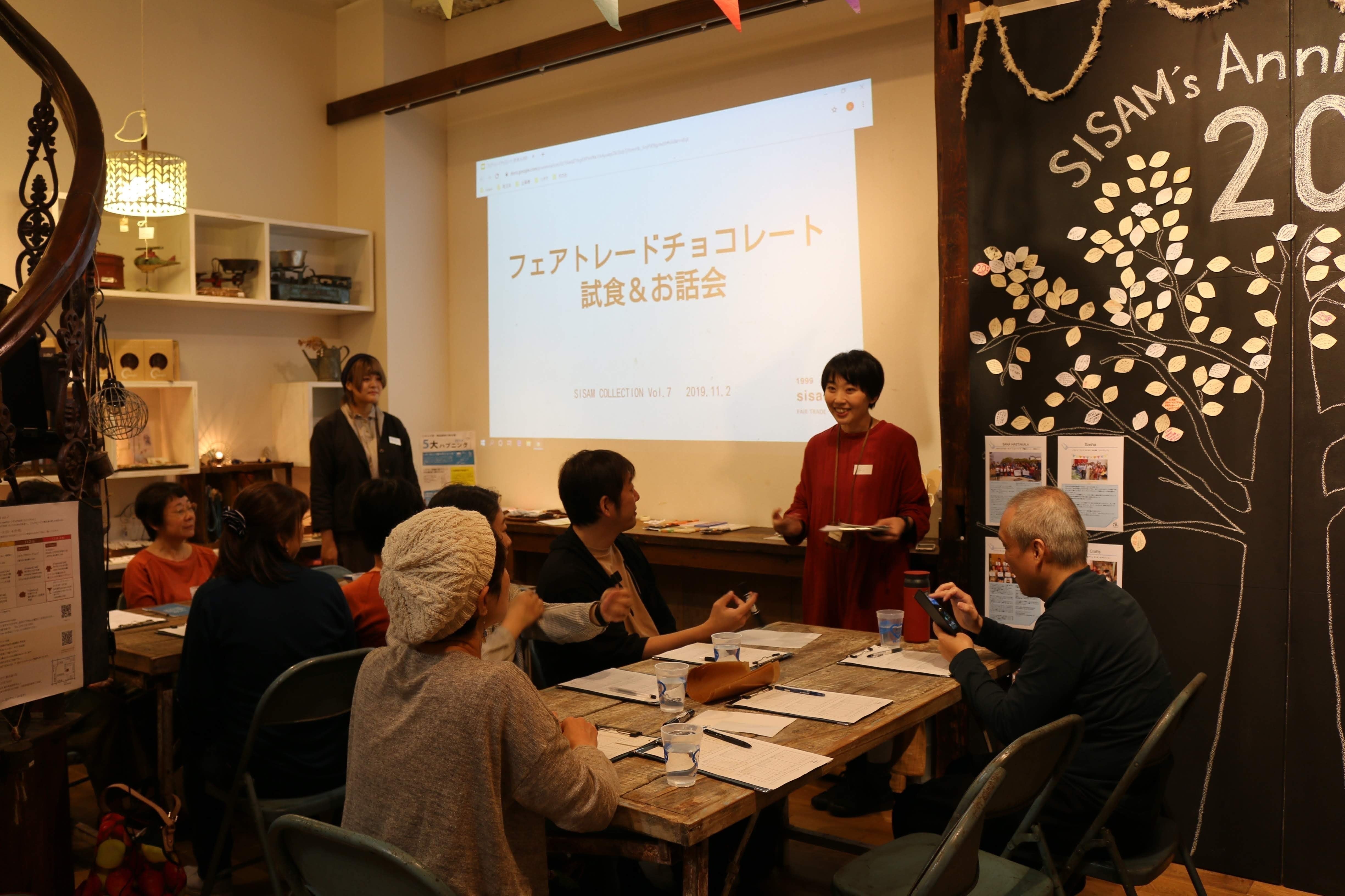 それは、11月初めのこと。ライフワークとしてやってきたフェアトレードチョコレート試食会を会社のイベントのワークショップのひとつとして、お仕事で担当させていただいたのです(!)その時に、シサム工房の人見さんが「チョコ兄さんタイジュ君が日本に帰ってきてるらしいから呼んでみよう!」と連絡。忙しい合間を縫って駆けつけてくれたのが、フィリピン・ミンダナオ島でカカオを育てているタイジュさんでした。