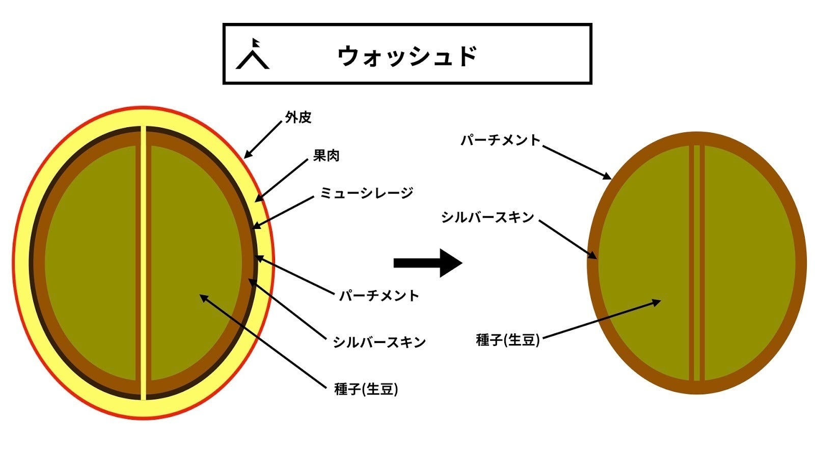 これはコーヒーチェリーを生豆(グリーンビーン)にするまでの工程のことです。