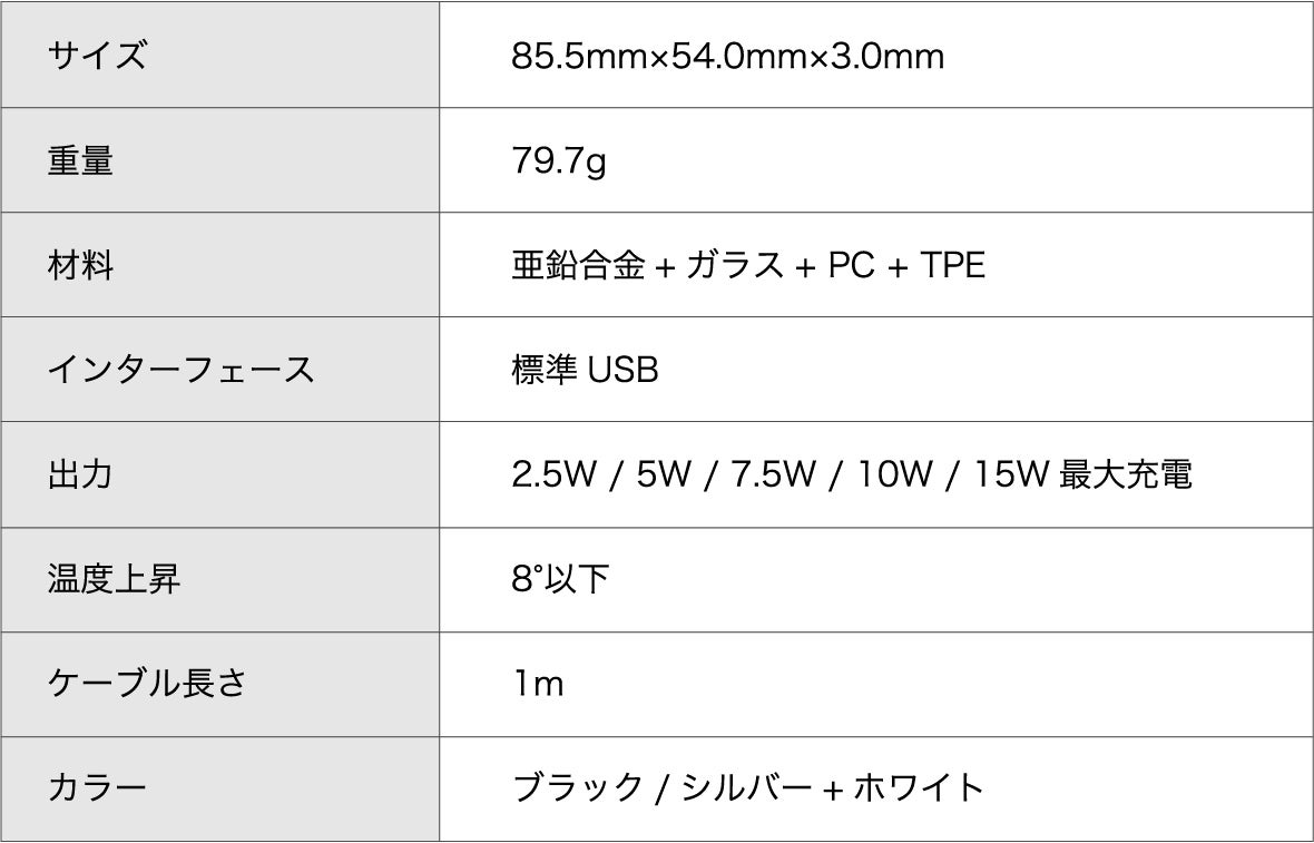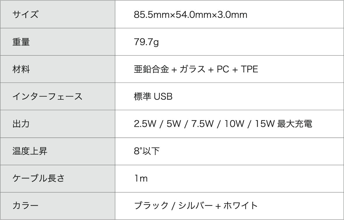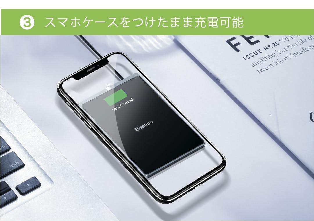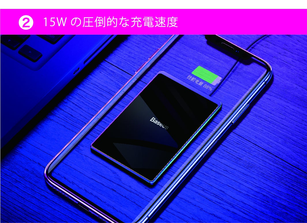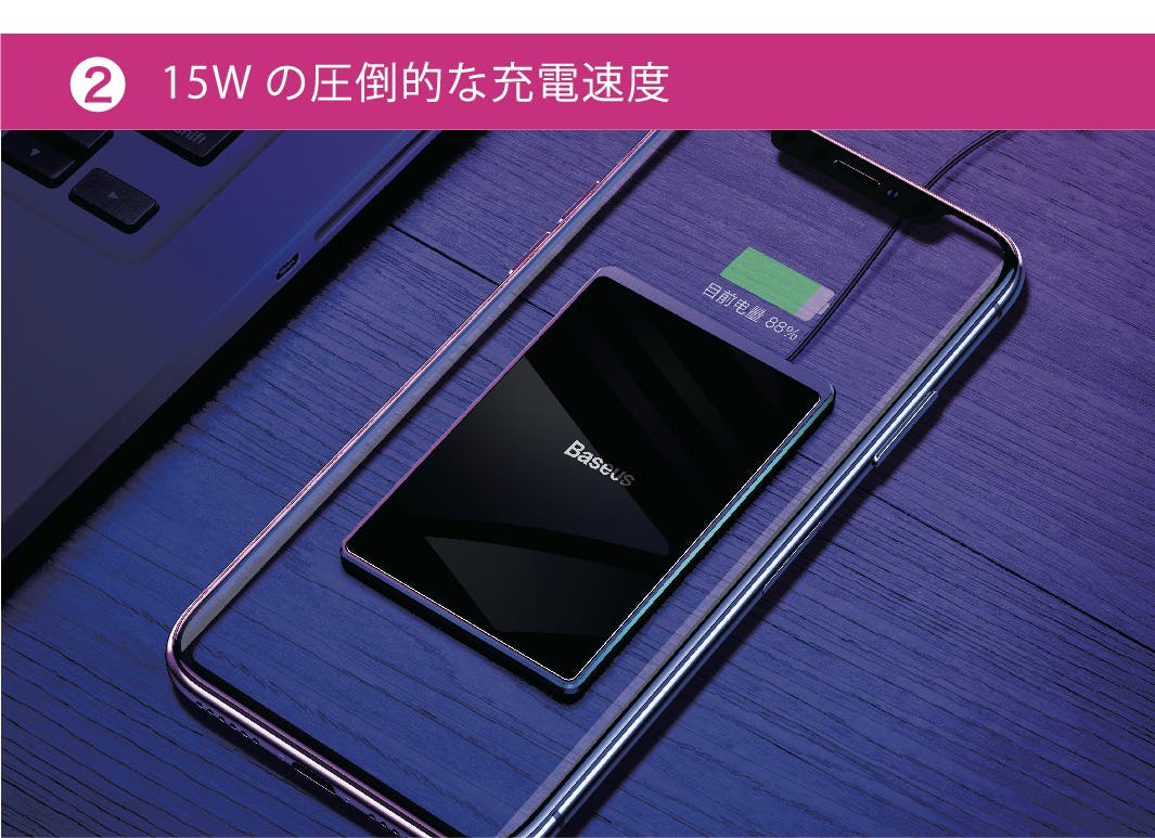 コンパクトだけれど最大15Wのパワフル出力で、従来のワイヤレスチャージャーに比べて高速に充電を行うことができます。充電パットにスマホを置くだけで充電が開始。充電ケーブルが不要なので、ケーブルを忘れて端末が使えなくなるということがありません。