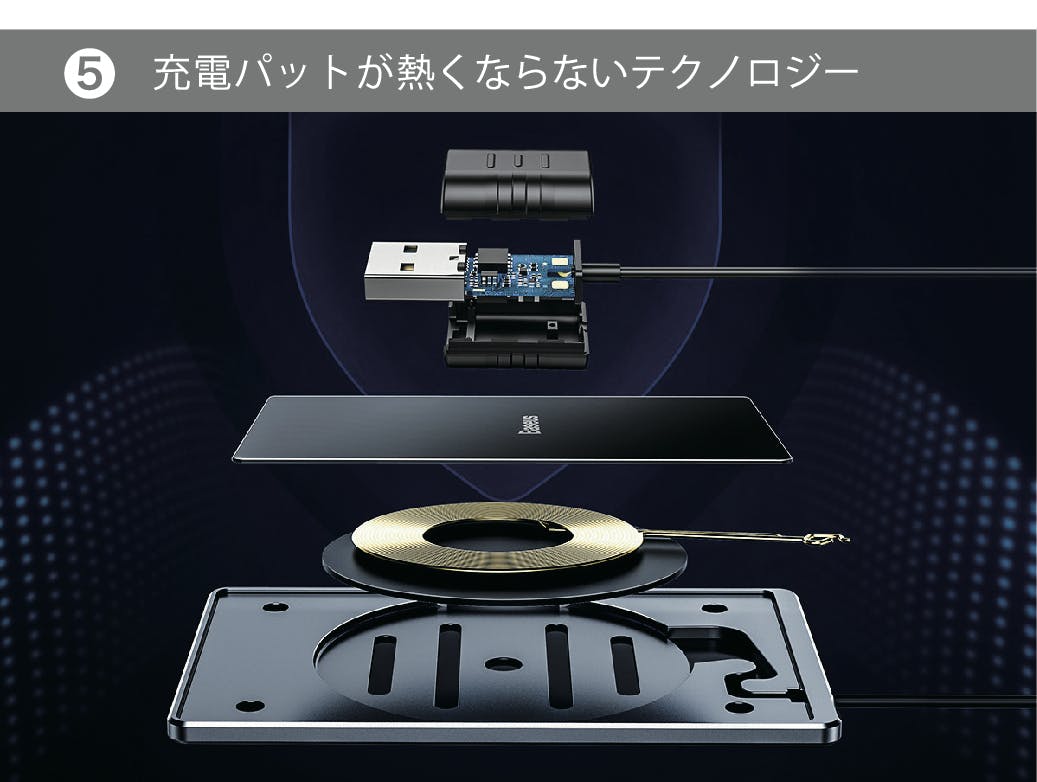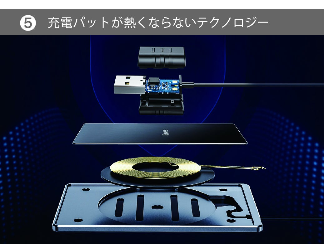発熱の主原因である制御基板を充電パット部からUSBコネクタ部分へ移すことにより、充電パットの発熱温度が約8度以下に抑えられ熱くなりません。急速充電でもスマホ側の保護機能(発熱による充電停止)の発動回数が少なく高速で充電しますので、充電時間を大幅に短縮できます。