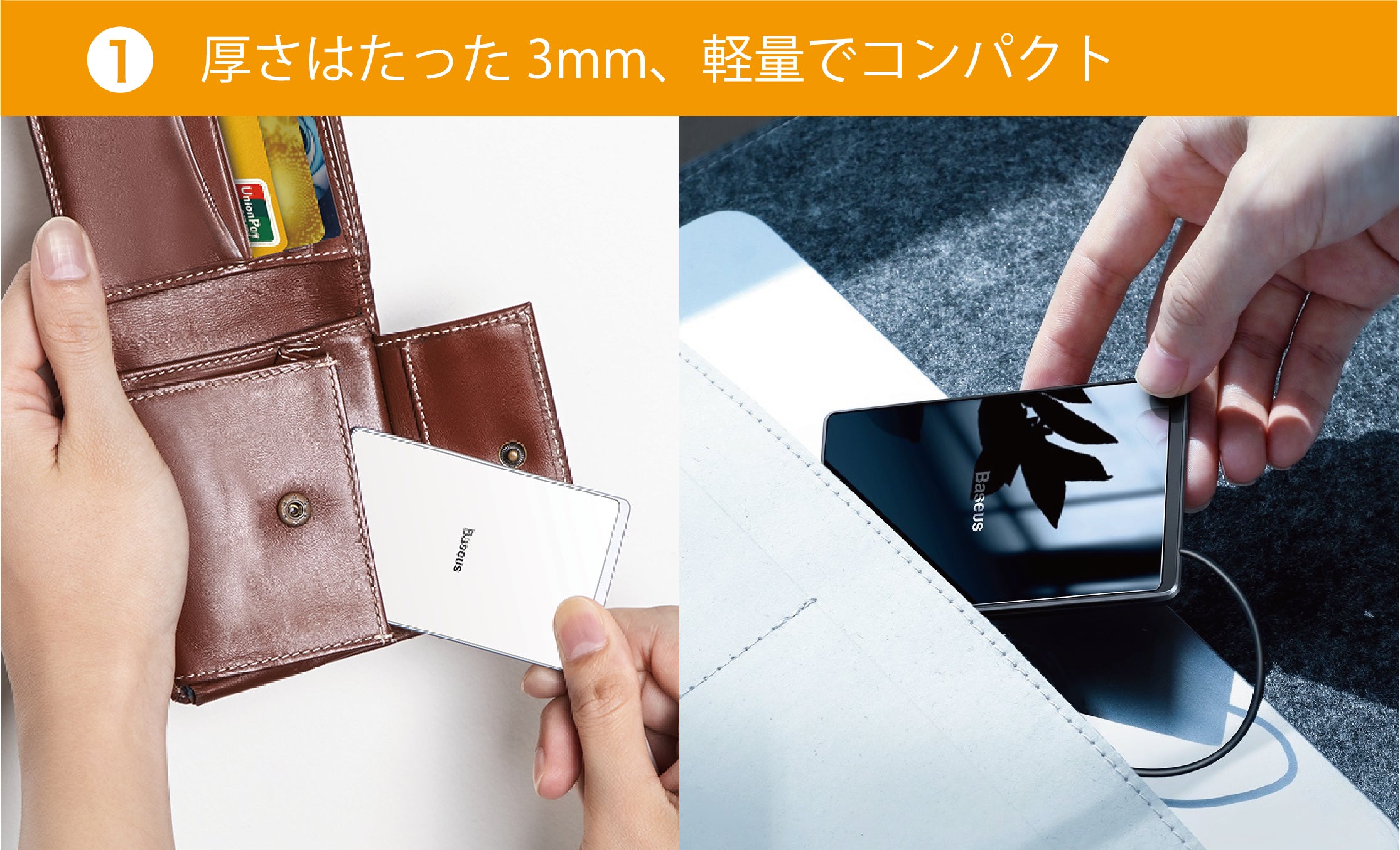 【ペーパー・チャージャー】は紙のような薄さで、厚さはわずか3mm。クレジットカードと同じサイズなので、財布にぴったり入るコンパクトさ。軽量で持ち運びにも便利です。家庭やオフィスやデスクはもちろん、アウトドア時にワイヤレス急速充電の最適さを体感できます。