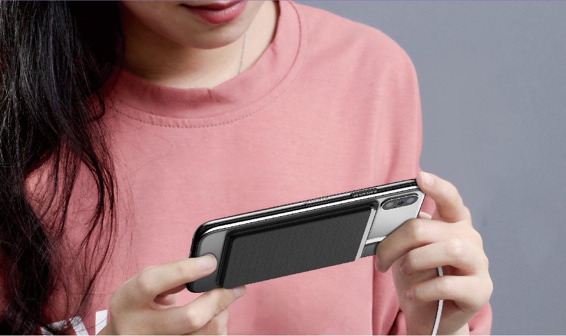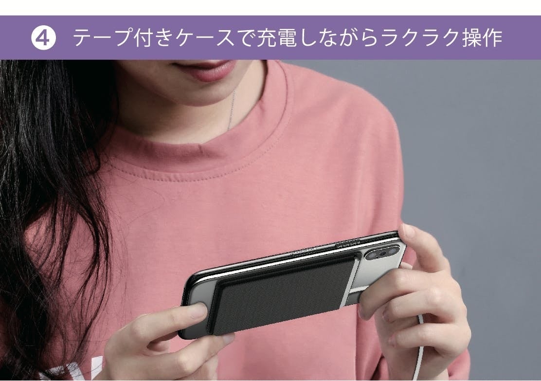 付属の収納ケースはテープ付きで、スマホの背面に貼り付けて何度でも使用できます。ゲームをしたり電話をかけるときもチャージャーが邪魔にならずに充電できます。