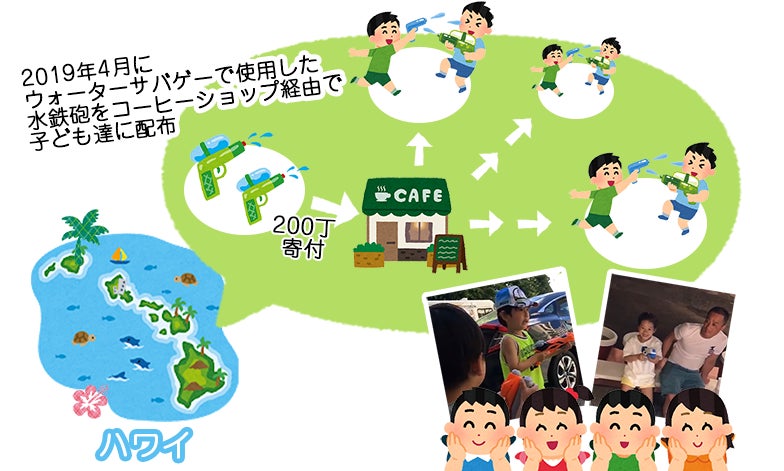 実は過去に、ハワイで開催したウォーターサバゲーにて使用した大量の水鉄砲を、友人の経営するコーヒーショップに預けて子ども達に配ってもらったことがあります。後日友人から送られてきた笑顔いっぱいの子ども達の写真を見て、本当に温かい気持ちになりました。