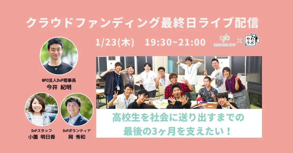 こんにちは、D×P中川です。いよいよ「年度末。高校生を社会に送り出すまでの最後の3ヶ月を支えたい! #DxP冬季募金」クラウドファンディングが本日最終日となりました!
