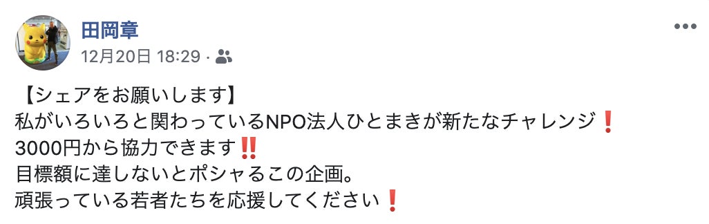 もしすでに支援を決めておられる方がおられましたら、ぜひ、お早めの支援をお願いします。(クレジット決済の場合は、達成後にしか決済されません。)