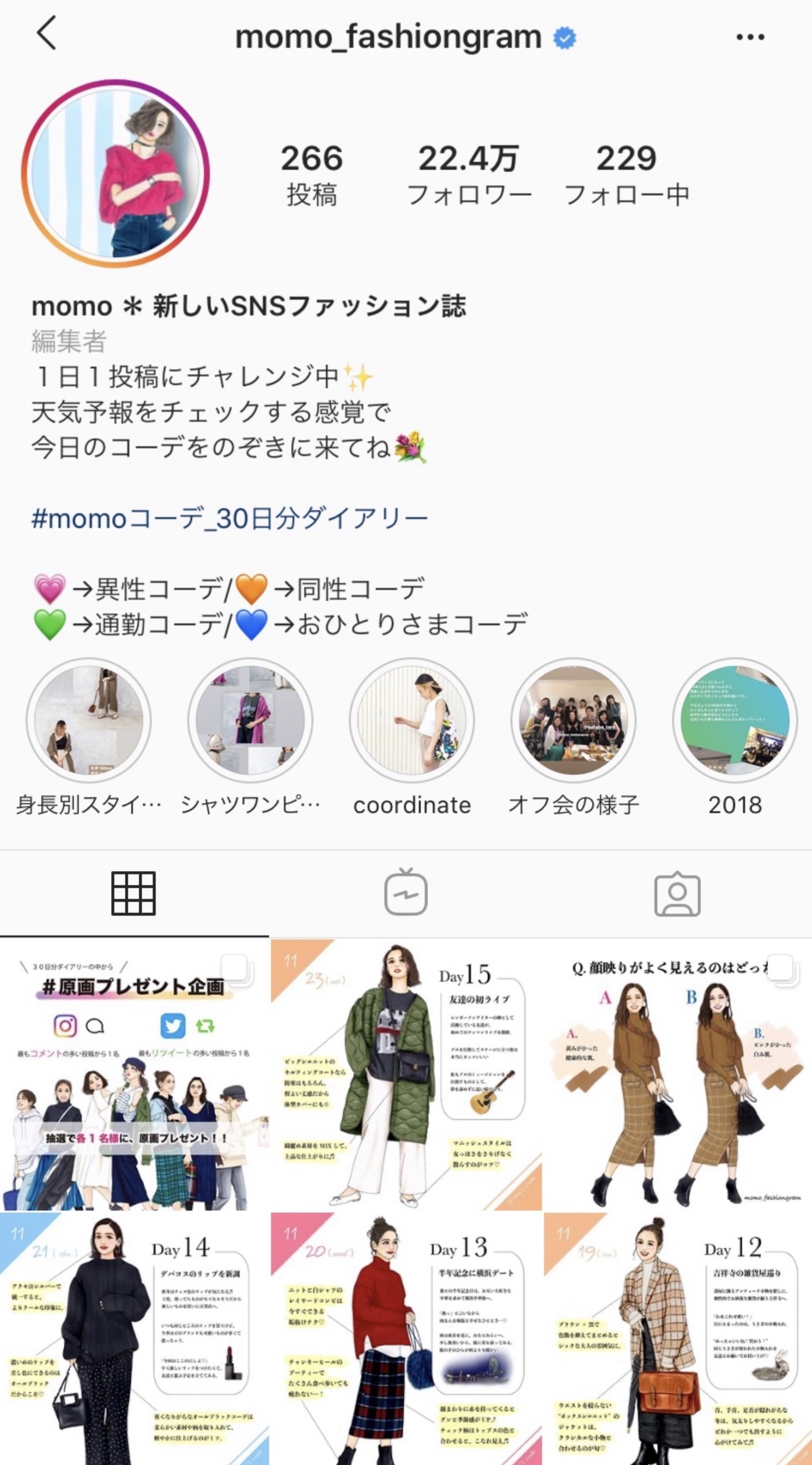 Instagramのアカウント@momo_fashiongramで、2016年12月からを発信を続けてきました。今は11月5日から始めた#momoコーデ_30日分ダイアリー で毎日投稿にチャレンジ中!♡